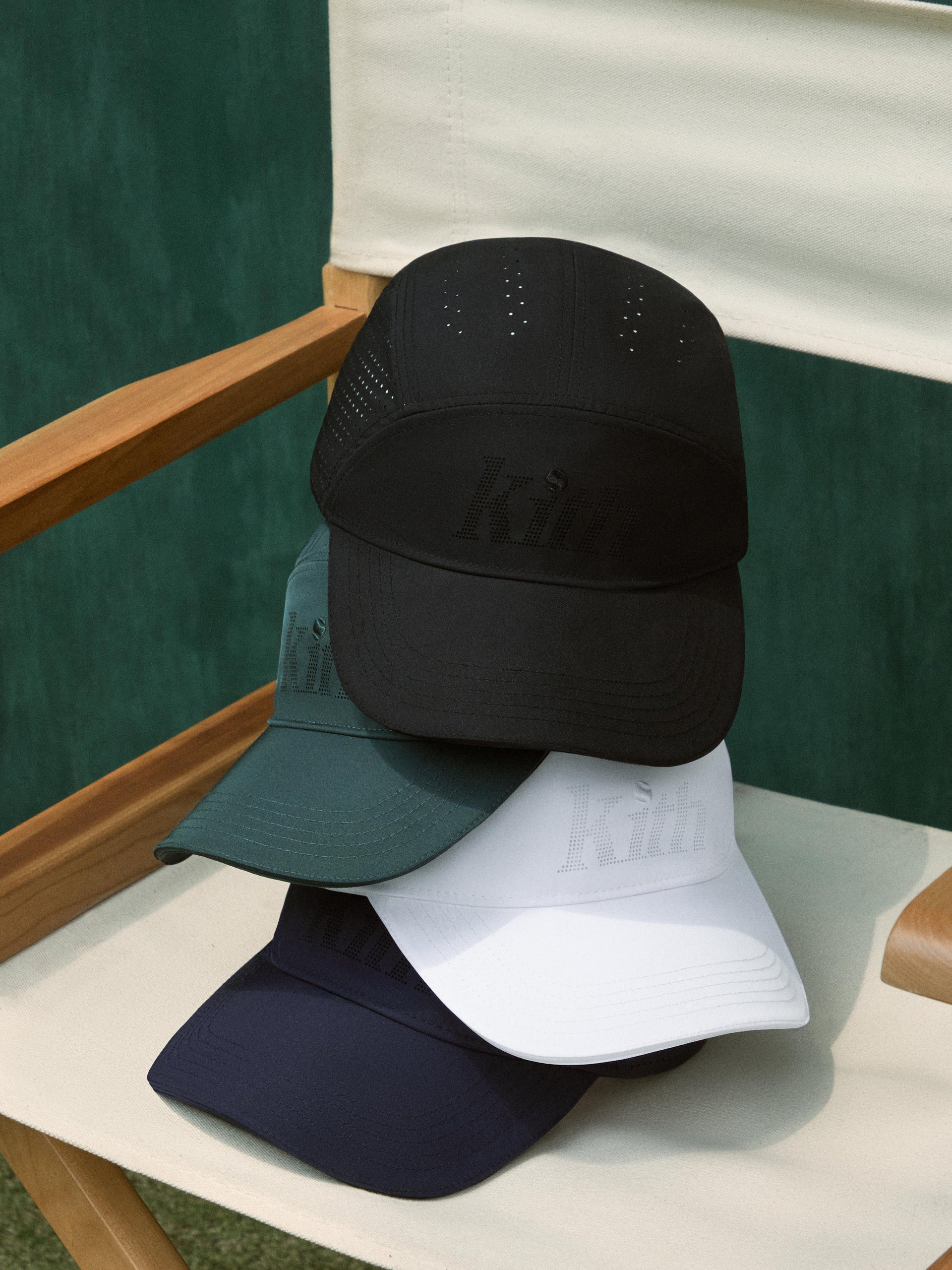 Lightweight, moisture-wicking headwear—seen in white, black, green and blue hues—is updated with new tennis Kith for Wilson branding.