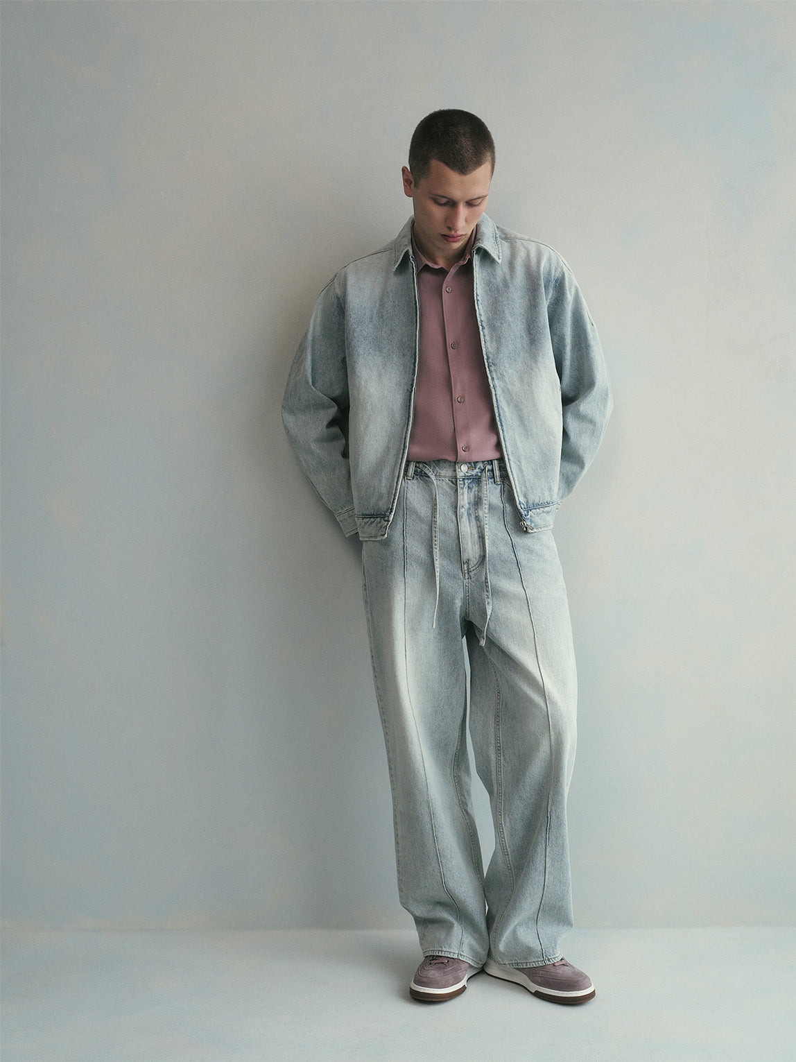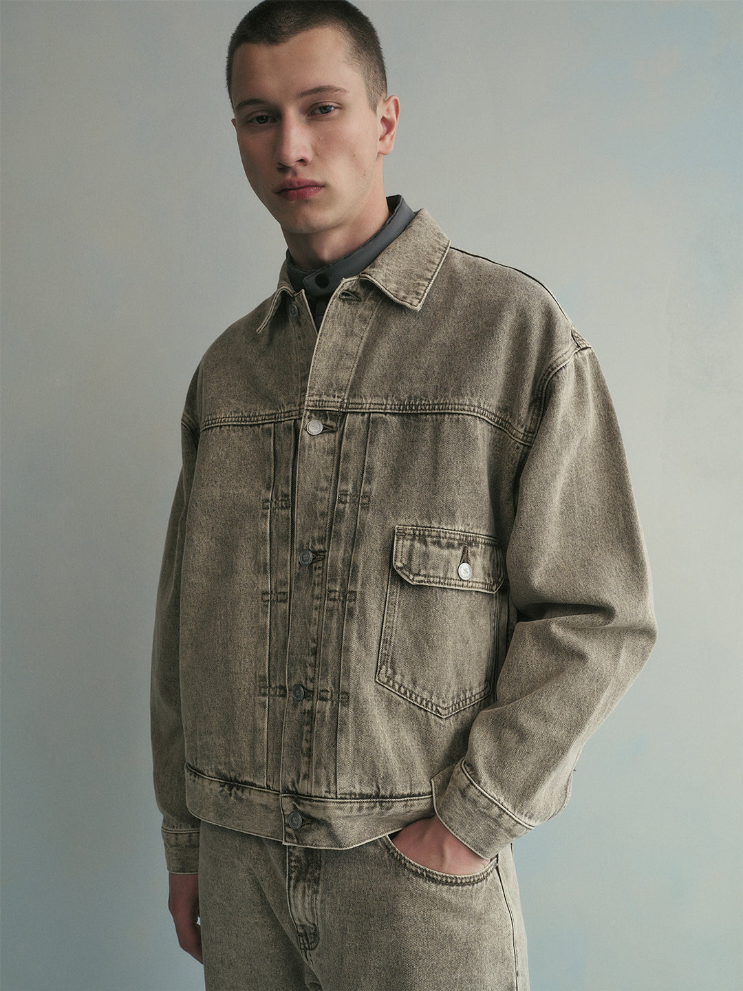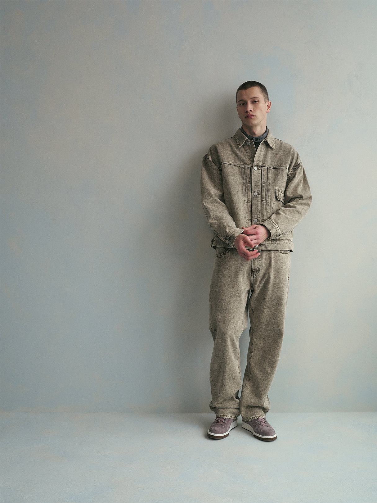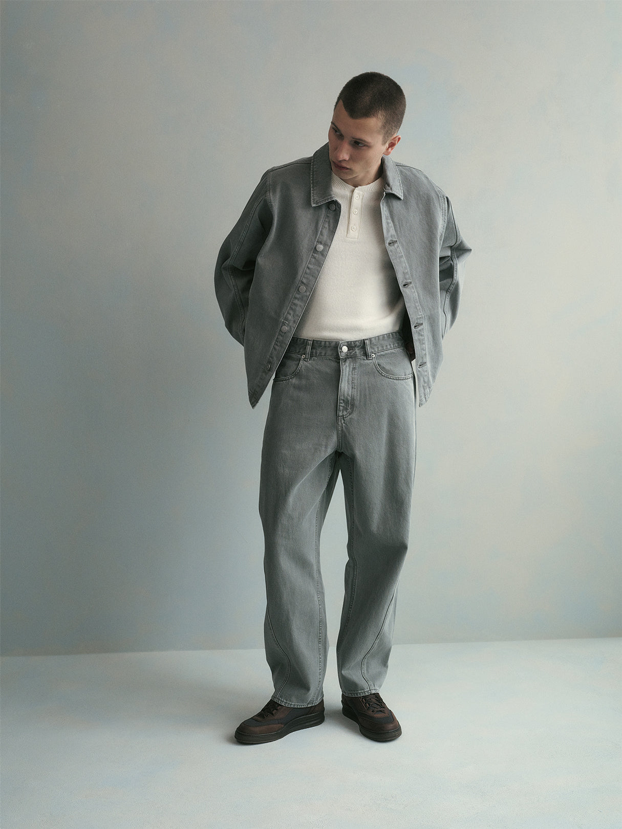 &Kin is highlighted by the Cassius Blouson Jacket, the Eli Pleated Trouser, and additional accessories made of brushed wool denim, a first of its kind fabrication that provides texture and depth to traditional silhouettes. A range of colors is also seen in the Spring 2026 Denim concentration, including Island Grey, Light Indigo, and the Tan Carter Wash, select silhouettes such as The Webster Chill featured in a variety. Explore jeans tailored to the specific fit preferences of each wearer, featuring the tapered Twist Seam Galen Pant, the baggy leg Zane Denim Pant, and the classic straight Webster Chill.
