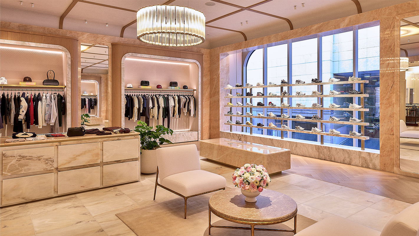 The second floor is dedicated to Kith Women, additional women’s brands, footwear, and Kith Kids, featuring a lighter space that contrasts the men’s floor. Adorning the top of the staircase is a custom chandelier centerpiece consisting of over thirty-times individual pendants hanging in a helix formation, captivating guests and evoking a new feeling upon entering into the women’s space. Visitors are charmed with the oak trimmed lime wash ceilings, Rosa Aurora Macchia Vecchia marble lined walls, and Rosa Aurora floor inset with an oak herringbone band. The apparel niches along the perimeter of the room are made of custom oak millwork embellished with Verde Jasmine marble frames. Displayed against the large store front windows is Women’s footwear and just opposite of it is a room dedicated to Women’s handbags and accessories.