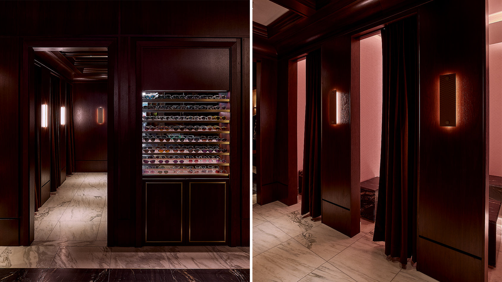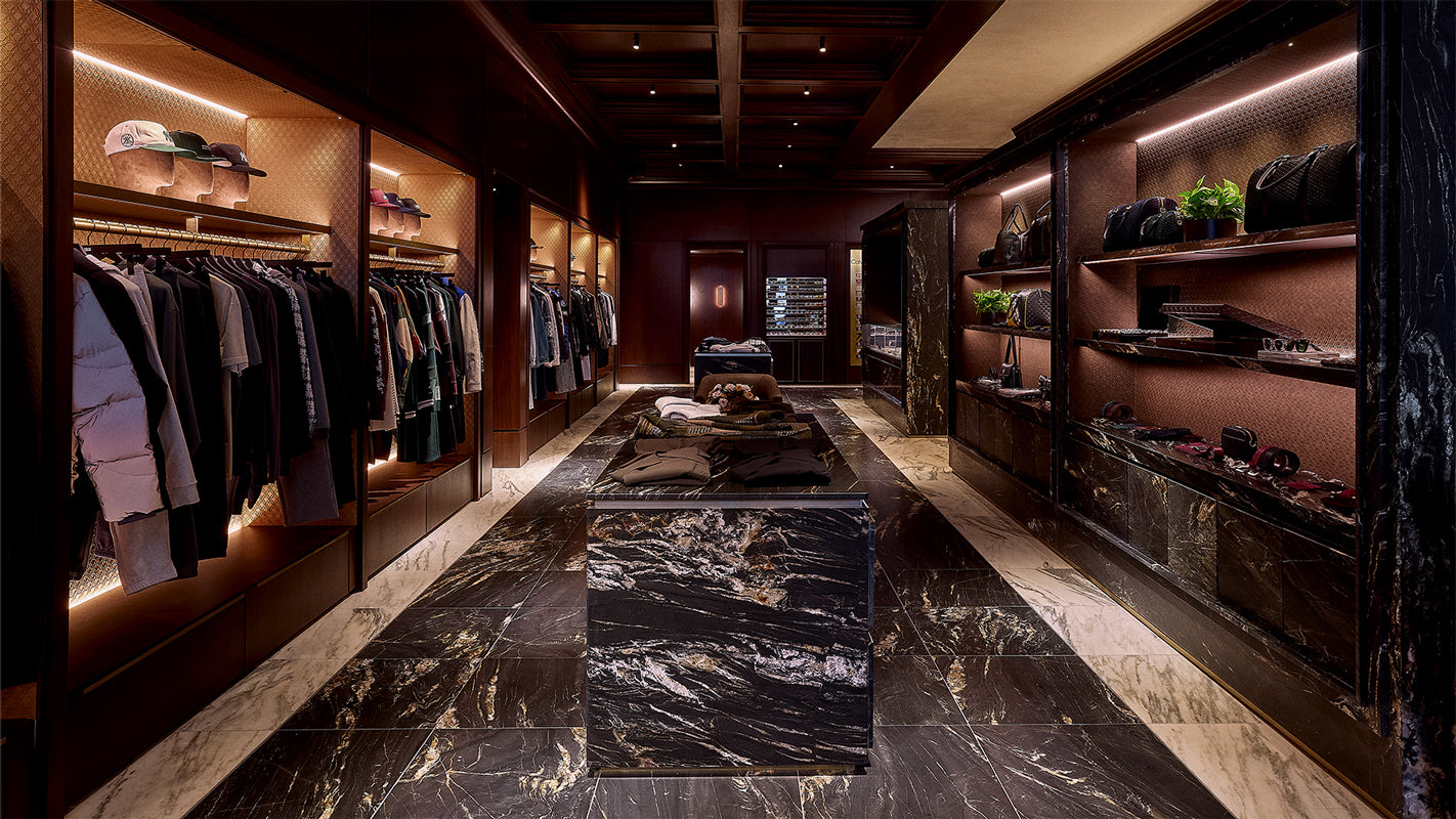 Visitors are surrounded by dark walnut millwork and a coffered ceiling when they enter the first floor of the space, housing Kith, additional brands, and footwear for men. There is Belvedere flooring complete with Montclair Danby marble bordering and apparel niches lined with custom K&K Crest embossed velvet and leather wallcovering. Displayed prominently along the center of the store are monolithic Belvedere caseworks displaying Kith’s lifestyle accessories, and jewelry on one side. On the opposite side features Men’s footwear accompanied by custom Mark Jupiter walnut benches.