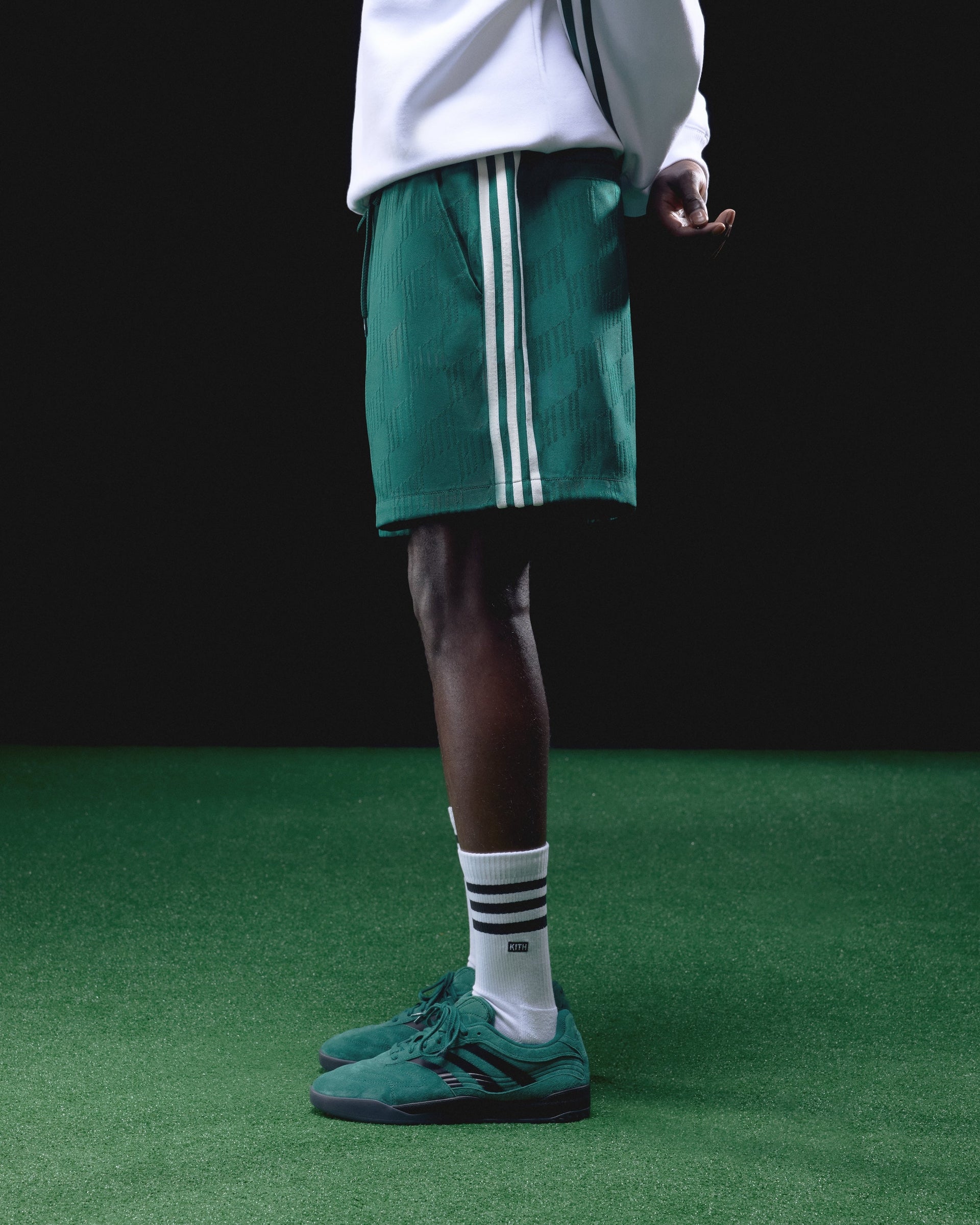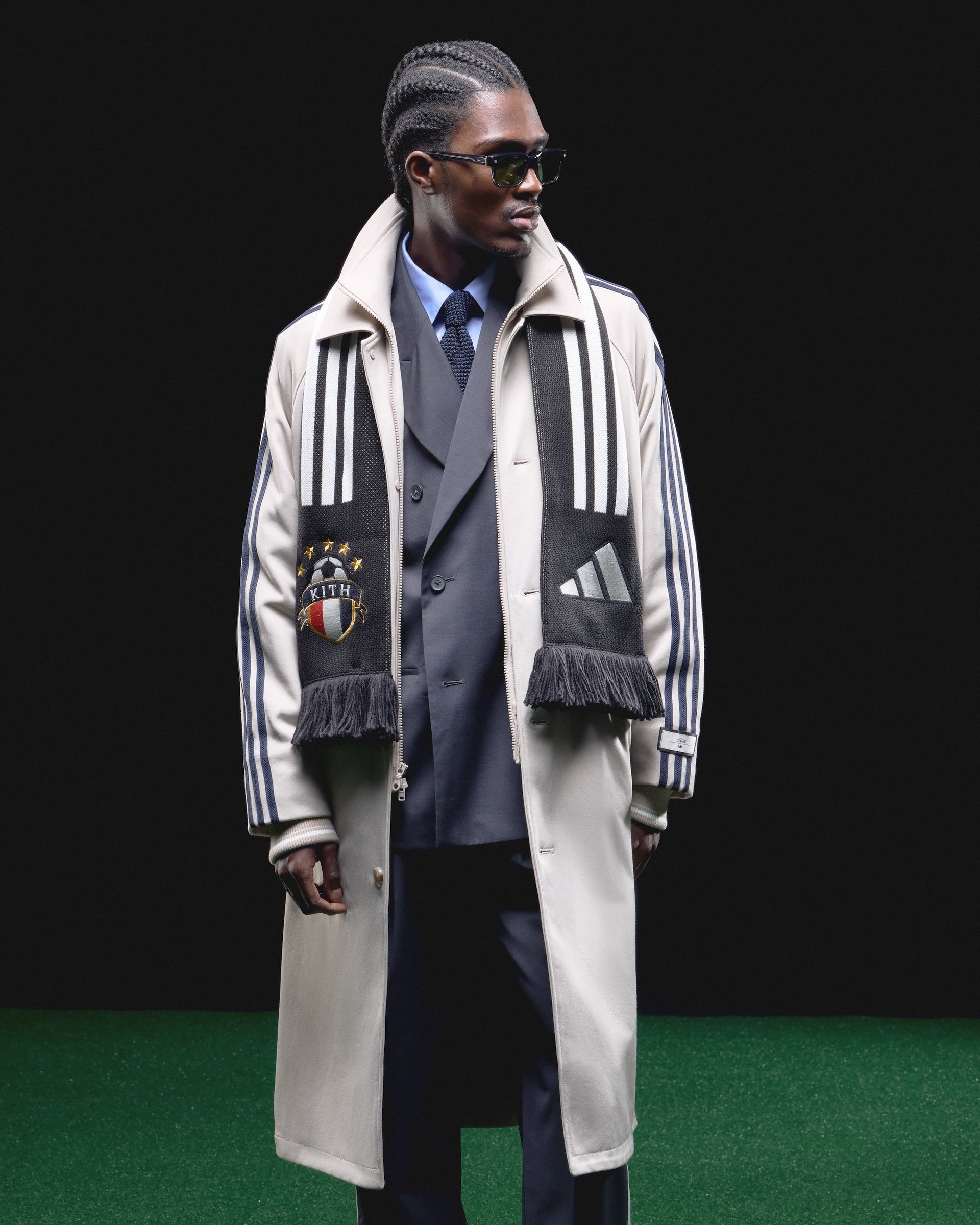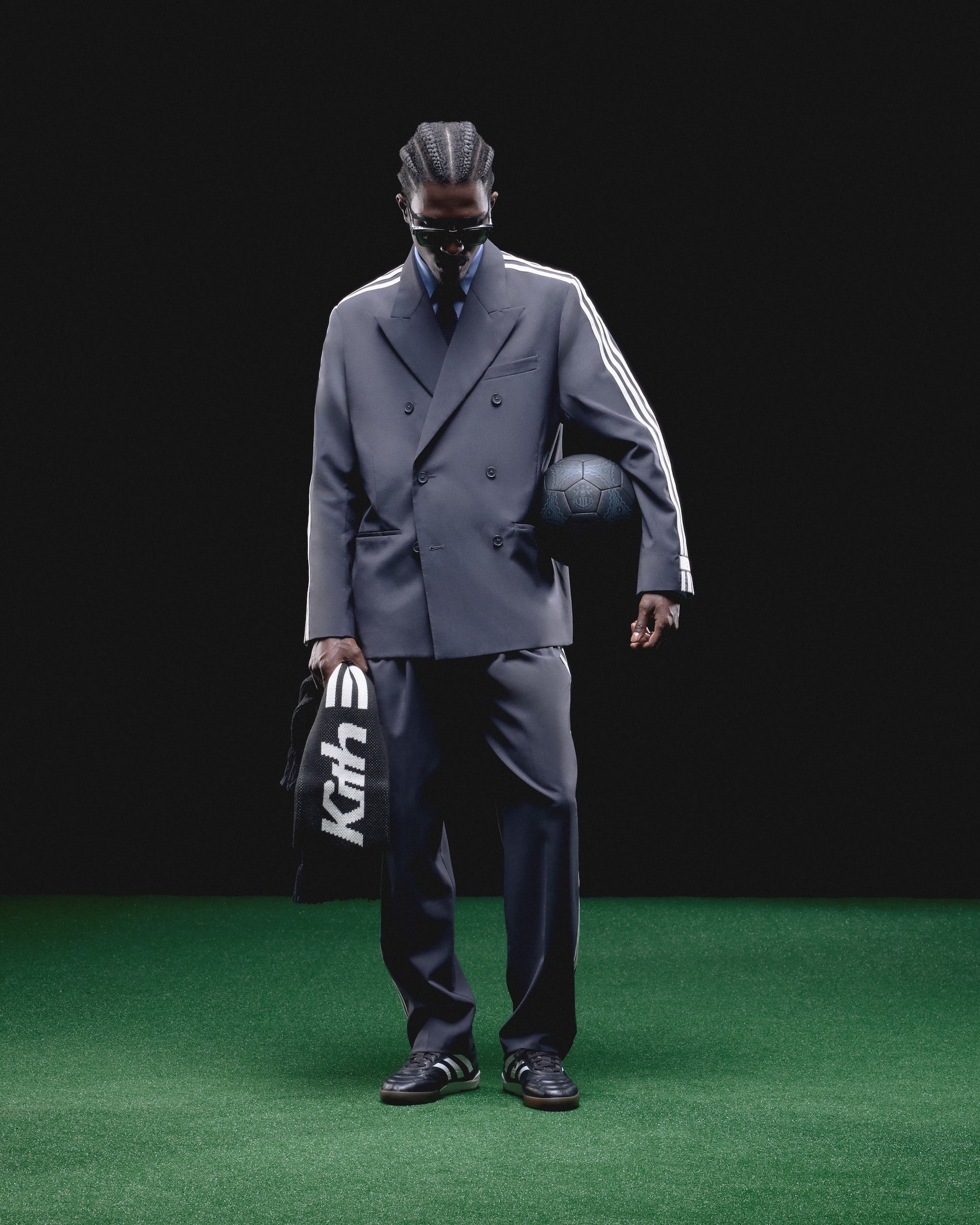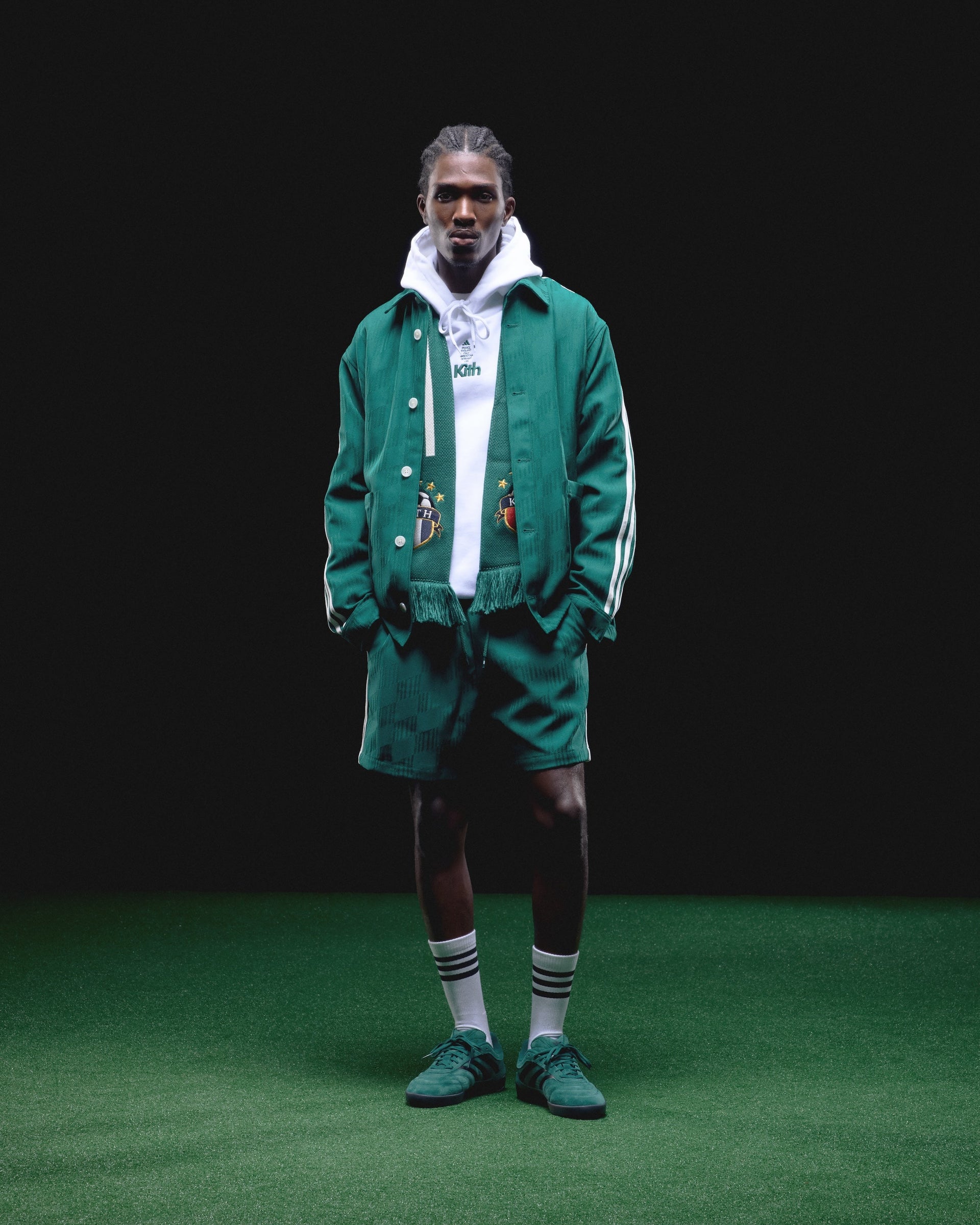 This collection comprises adidas & Kith signature silhouettes, highlighting debut co-branded logos and artwork. Explore elevated outerwear, jerseys, tracksuits, tees, and knitwear. Standouts include the Stadium Coat, Suit Jacket & Pant and Tracksuit. The Stadium Coat is an elevated yet relaxed silhouette crafted from premium leather. Details include signature adidas stripes along the back & hood as well as a built-in wraparound belt. The Suit Jacket & Pant, based on Kith’s Julius Blazer and Kylan Pant, epitomizes the intersection of luxury and football. Made from a premium wool-polyester blend, this suit features a double-breasted jacket and double-pleated trousers. The Kith for adidas Football Tracksuit is inspired by adidas’ iconic tracksuit. The duo came together to reimagine the style with a custom knit execution & piping details along the front. The set is offered in Beige & Green executions and is complete with a co-branded label.