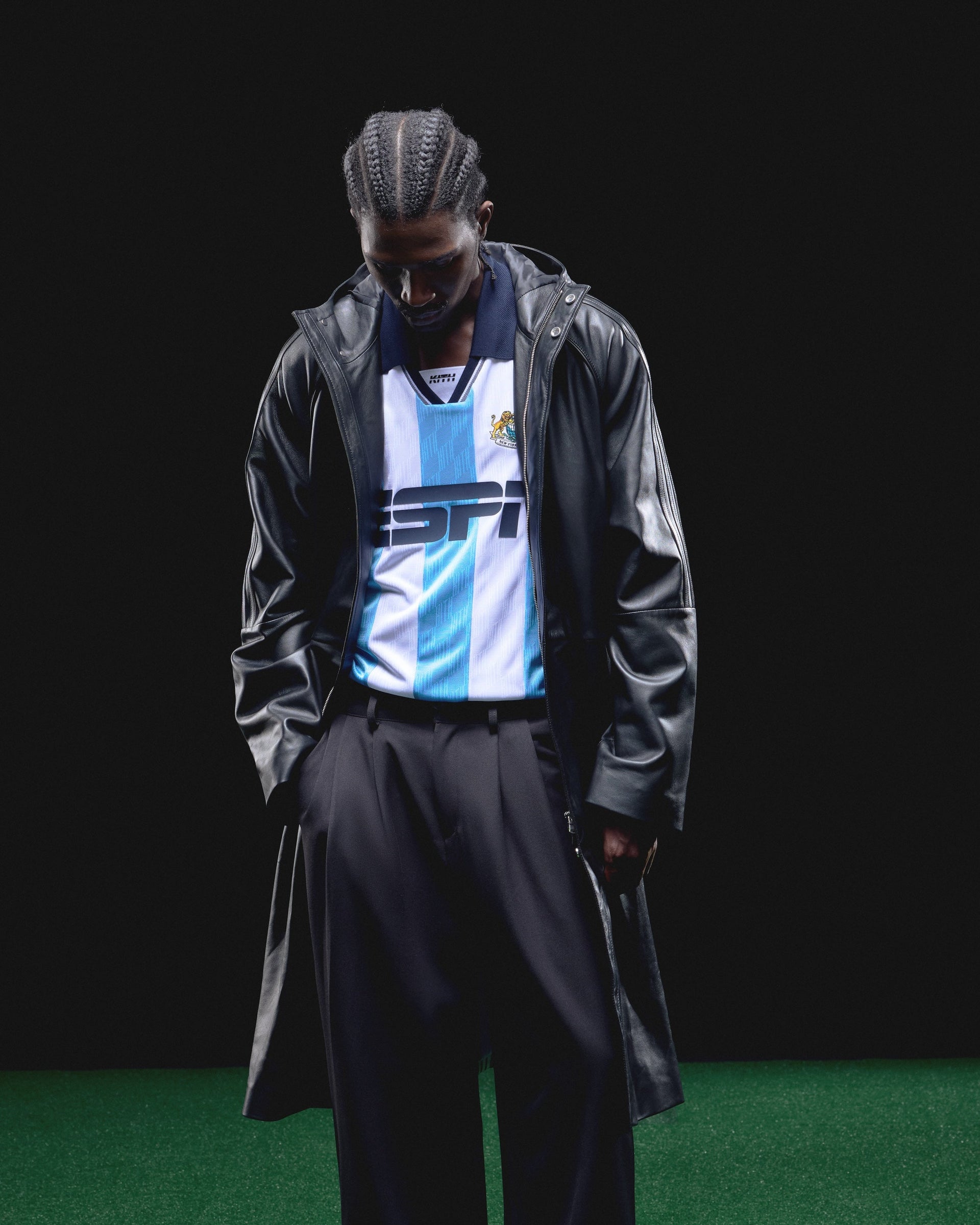 Kith and adidas collaborated with ESPN on custom soccer jerseys and an elevated jacket. The Kith & adidas Football for ESPN Jersey, made from lightweight polyester, has a color-blocked composition and showcases italicized Kith Monogram artwork as well as Kith, adidas and ESPN branding. The Hybrid Trench Coat, crafted from genuine Nappa leather, features striped detailing along the sleeves, a zipped interior and a multi-colored ESPN-branded satin lining.