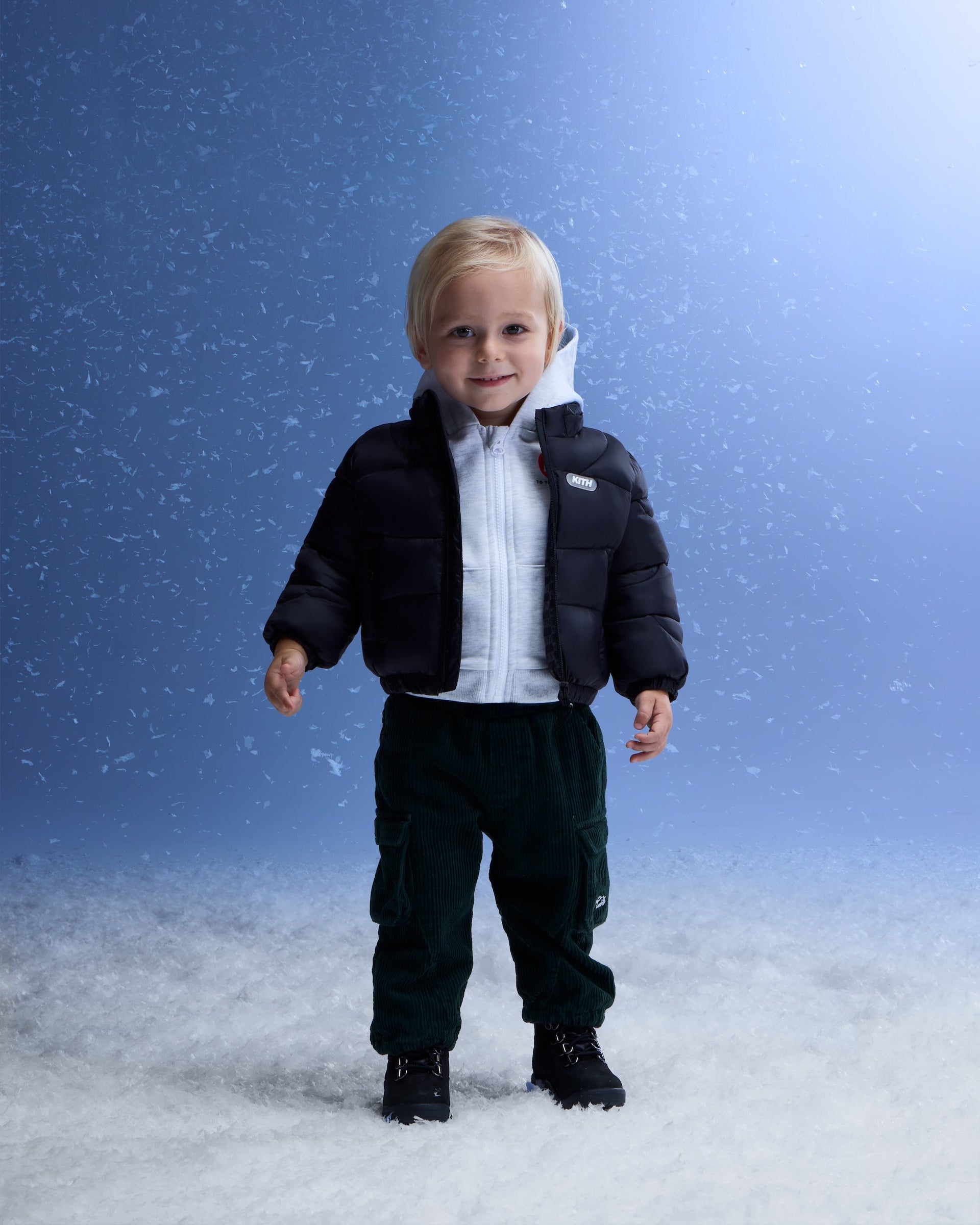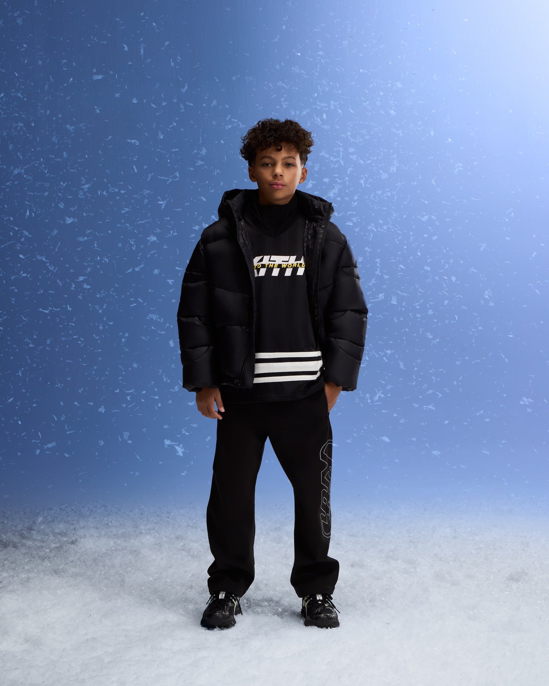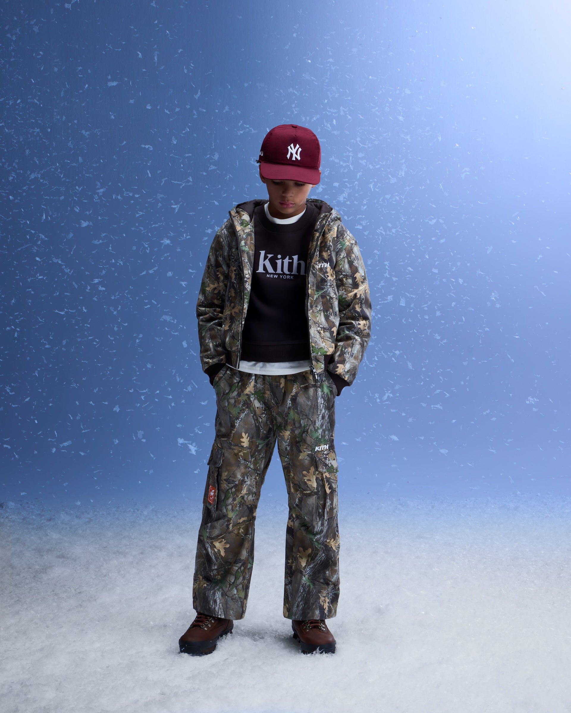 The Kith Kids Winter Classics 2025 collection is defined by updated Kith branding throughout, including new wordmarks such as holographic artwork, tech-inspired and color-blocked novelty logos, and jacquard techniques. This season sees the introduction of the Nelson in Snap-Front and Hoodie styles to Kith Kids, alongside the Long Sleeve Mulberry Tee, Quinn Tee, and the Puck Tee for optimal layering during colder months. This assortment also features outerwear like the Classic Midi Puffer, the Reflective Midi Puffer, and the Corey Puffer, inspired by Kith silhouettes. Additional subcollections include a workwear inspired capsule with an all-over camo print and contrast Orange accents, track sets, and classic shirting.