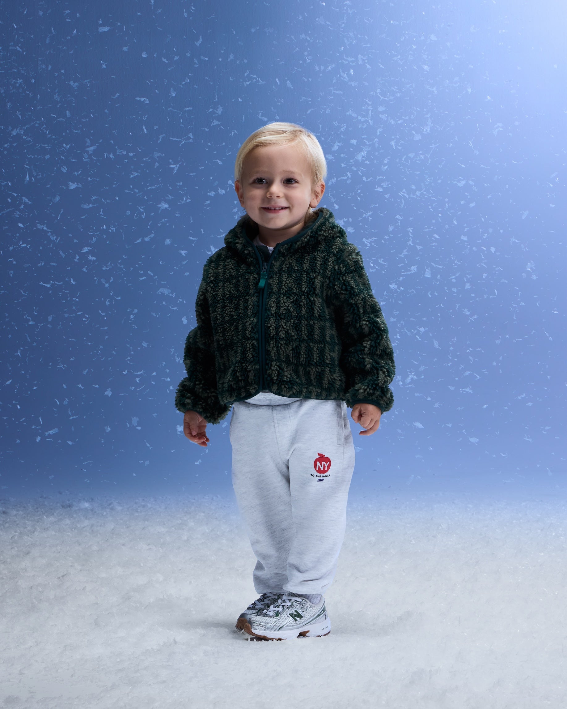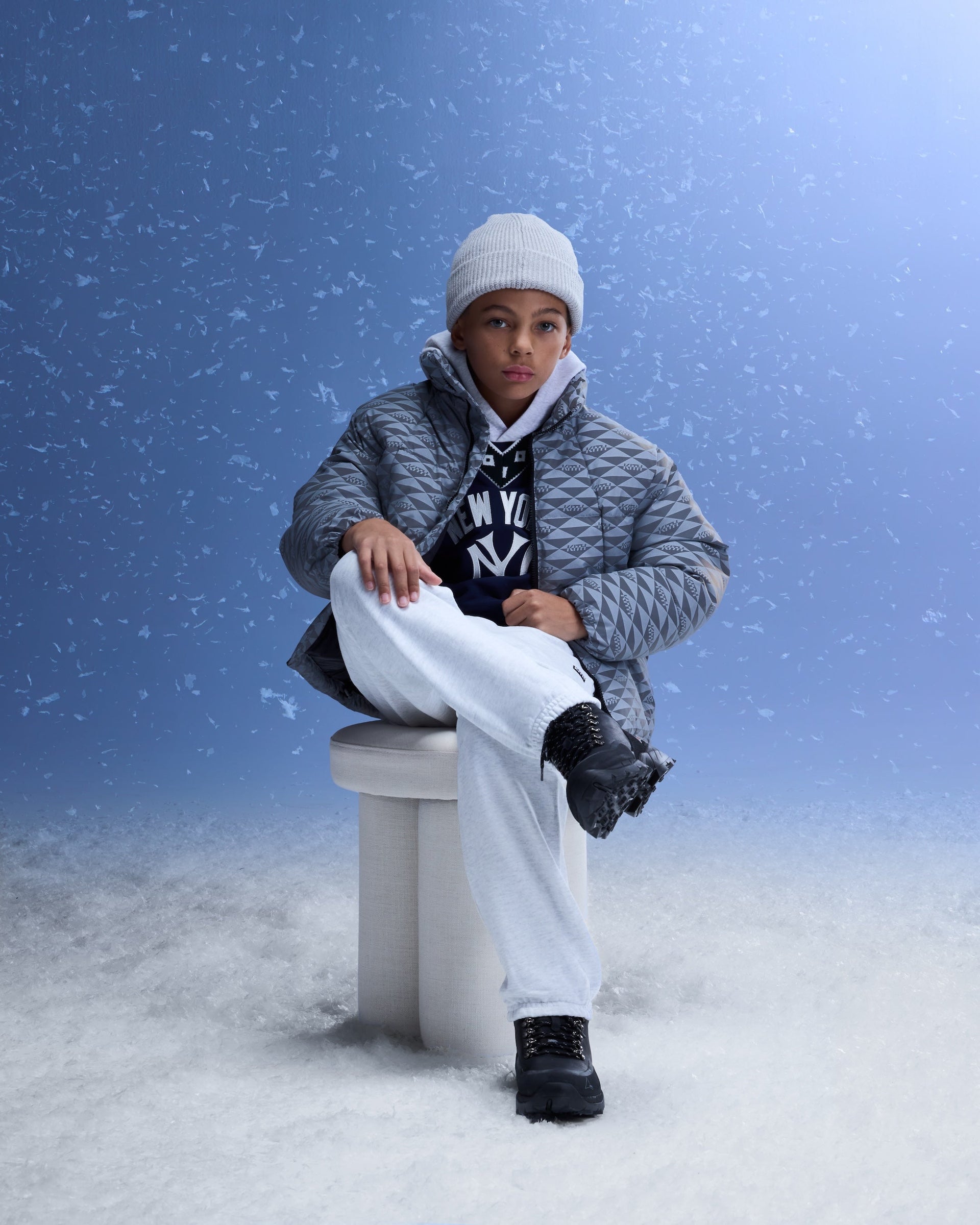 Outerwear from Kith Kids Winter 2025 is a focal point, featured in all-over printed novelty and everyday staple silhouettes such as the Faux Fur Monogram Royce Coat, the New York Yankees Lloyd Sherpa Jacket, and the Cropped Faux Fur Hooded Puffer, alongside the Monogram Sherpa, the Color-Blocked Sherpa Antony Full Zip, and the Clarke Color-Blocked Faux Shearling Jacket. The assortment of matching sets has seasonally-inspired motifs such as the Printed Scenic Nelson Hoodie & Sweatpant, the Novelty Textured Phoebe Jacket & Skirt, and the Cropped Celyse Sweater Hoodie and Pleated Sweater Skort.