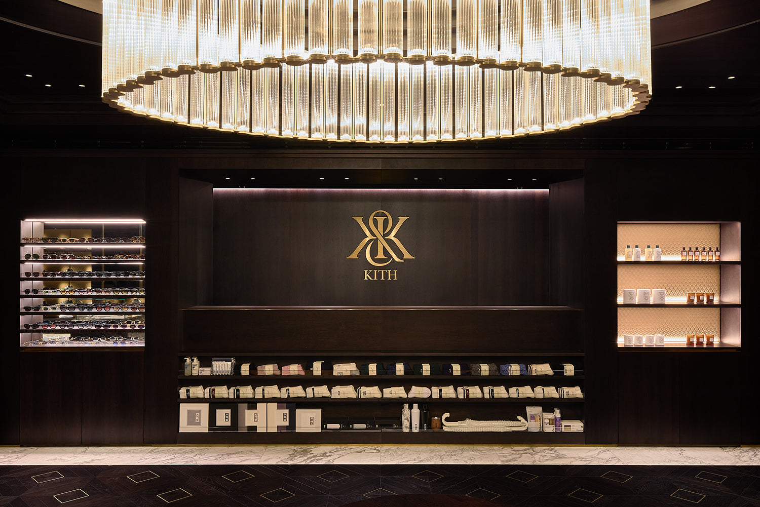 On each side of the entrance is Kith Kids and Kith Treats, Kith Kids featuring a lighter color palette defined by its signature cloud motif turned into the ceiling structure and Kith Monogramming throughout. Defining materials are Estremoz marble, a custom fan mosaic, and satin brass accents, featuring an elevated playful spirit that encompasses the Kith Kids brand. Kith Treats has classic bar-style seating, a muted pastel palette with the same custom fan mosaic found in Kith Kids, Rosa Portugalo, and Azul Cielo marble alongside Volakas marble counters, and stainless steel trim and accent metal. Kith Treats London will feature all mainstay menu items, alongside Signature Specials exclusive to that location.