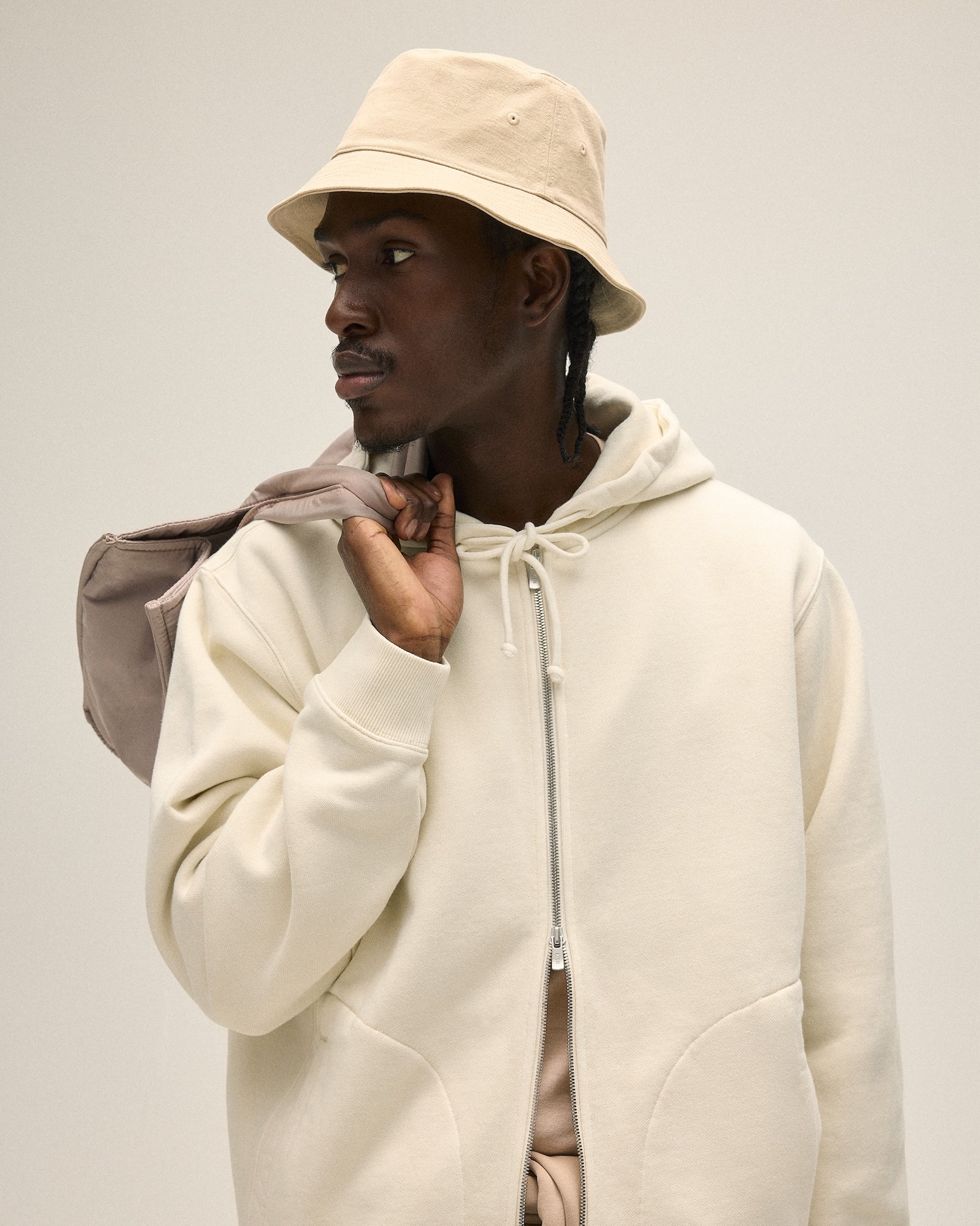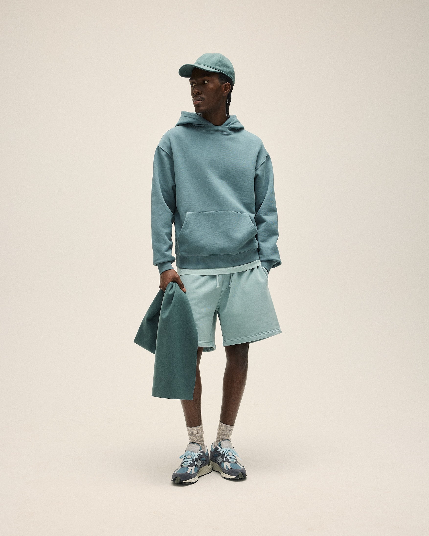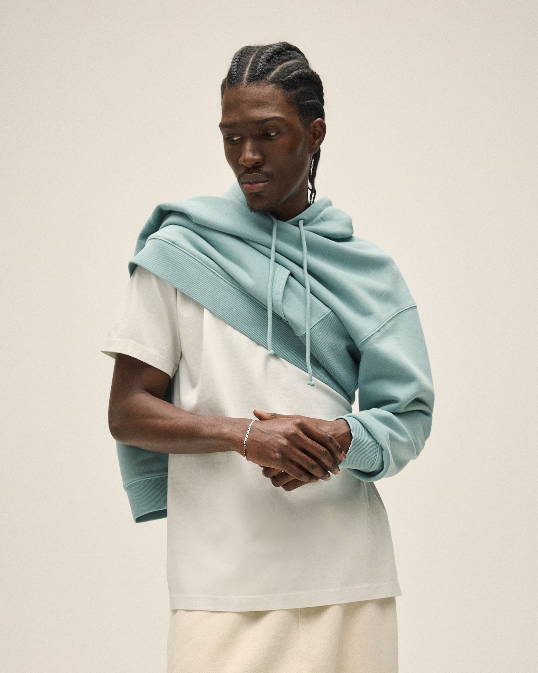 Standout sets in a variety of coordinating hues define the Spring 101 offering. Executed in Reef— a muted blue—is the heavyweight plush back fleece Williams II Hoodie paired with the plush back fleece Jordan Short and cotton jersey Leonard Tee. Seen in washed charcoal Nightfall and Hall hues, are the Williams II Hoodie & Elmhurst Pant in lofty brushed fleece alongside the Bishop Tee in sueded cotton jersey. Also crafted from lofty brushed fleece are the Williams V Hoodie and Nelson Sweatpant, which showcase our cream, beige shade, Article.