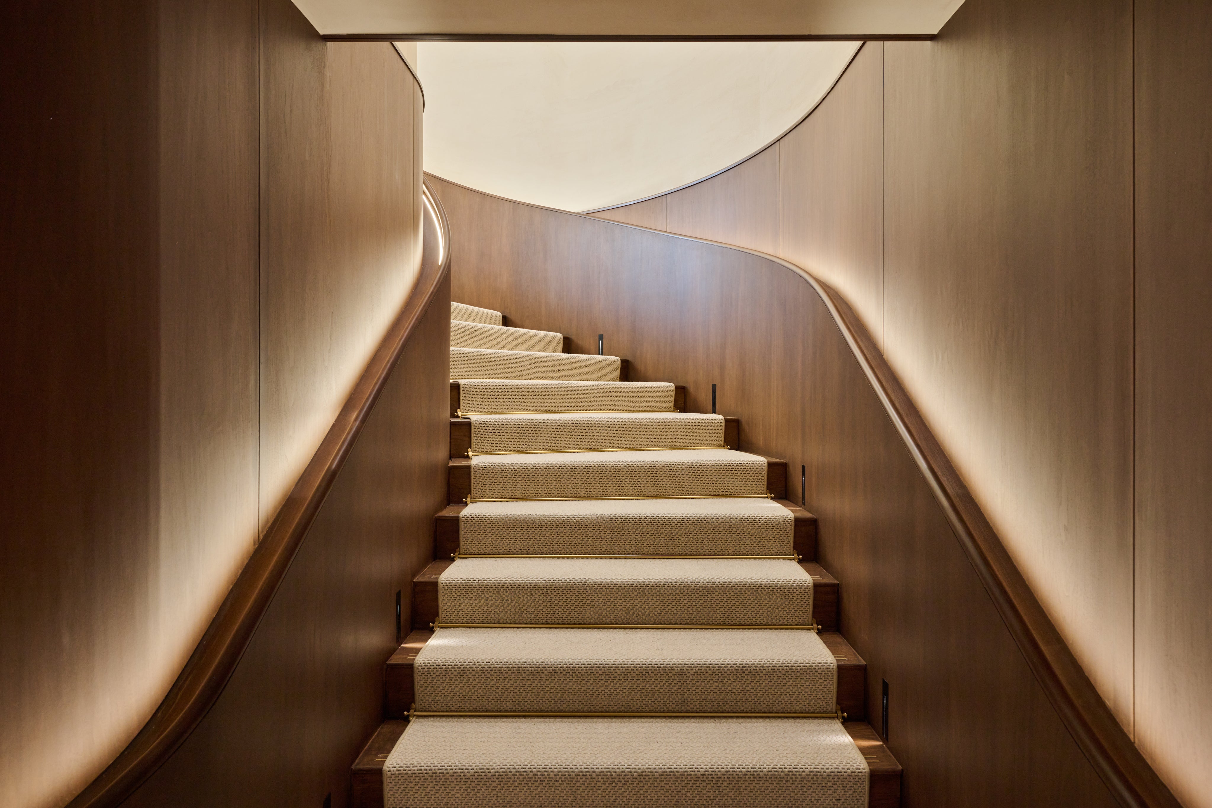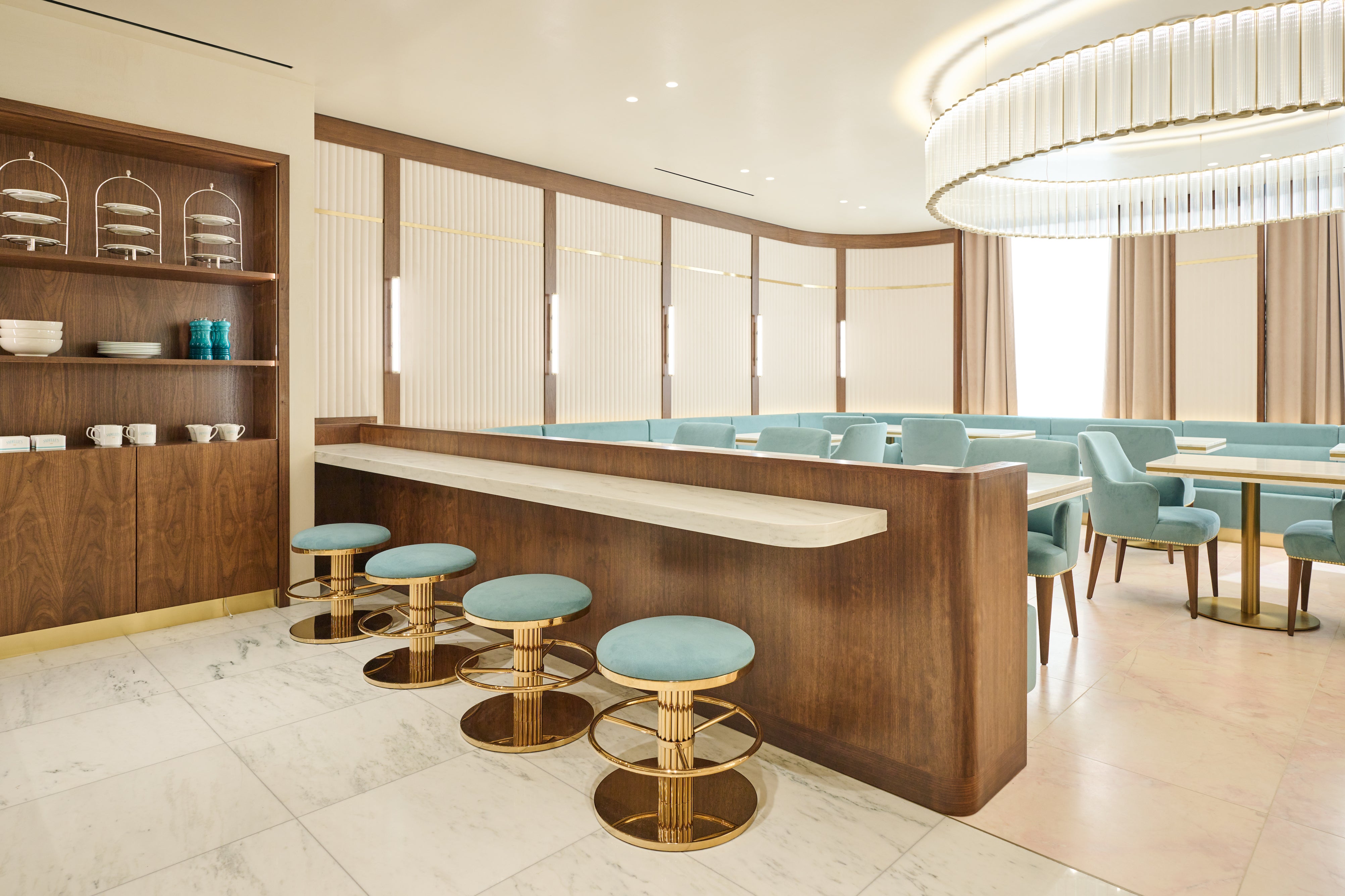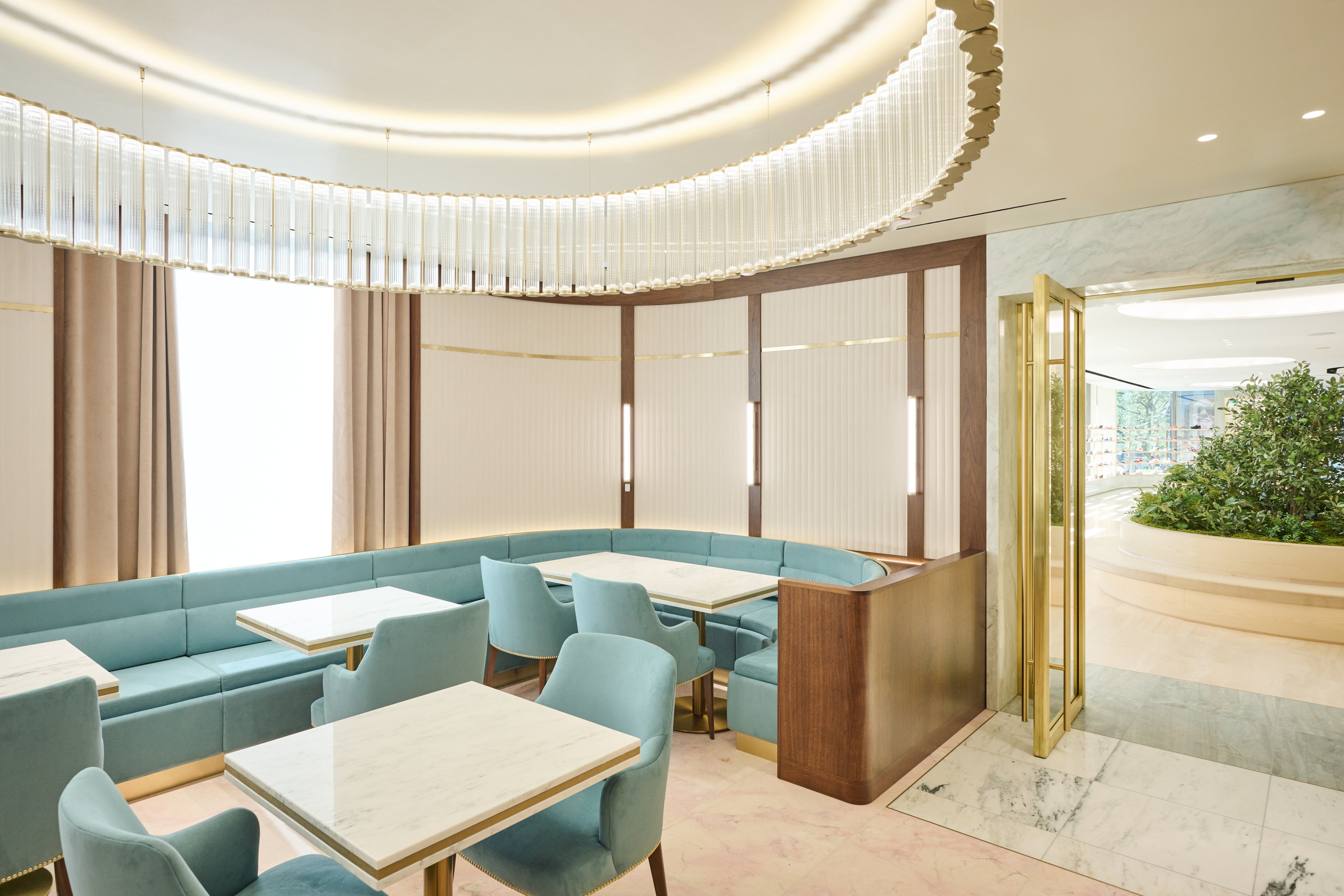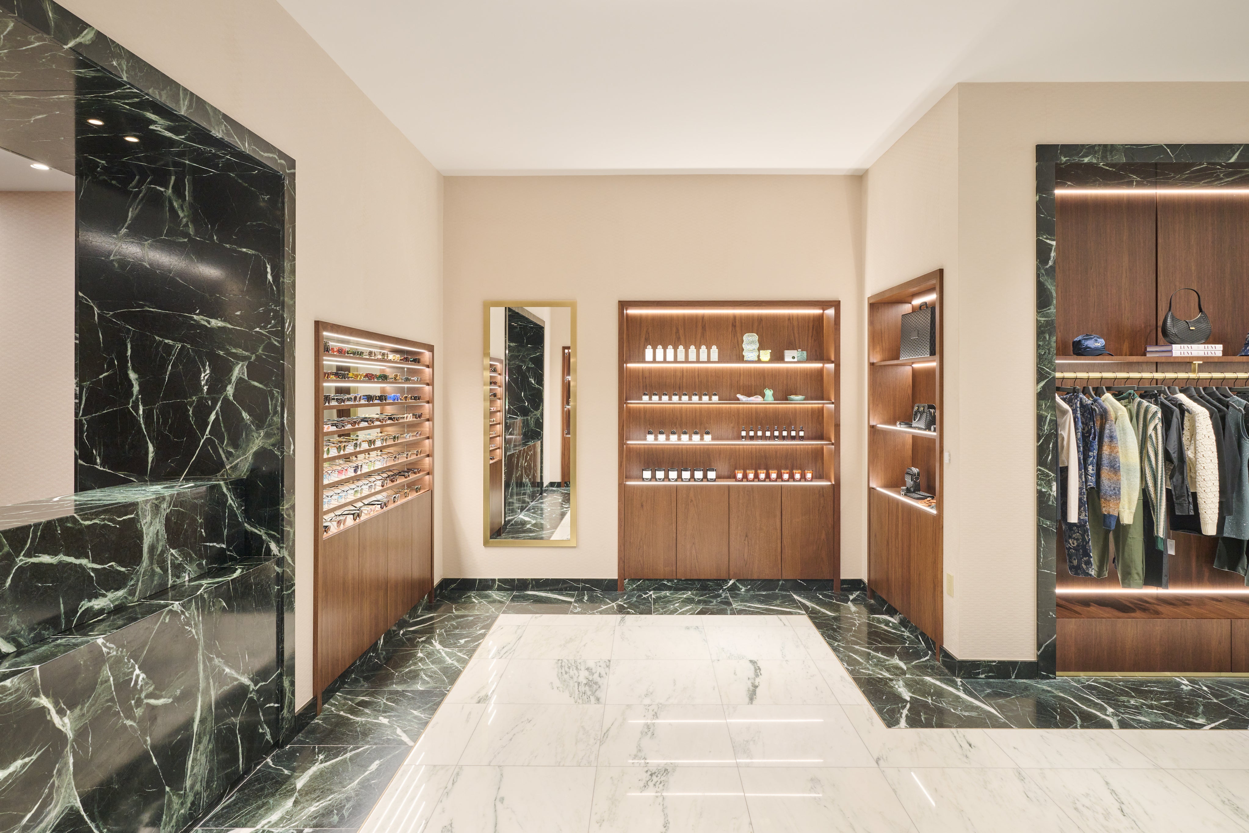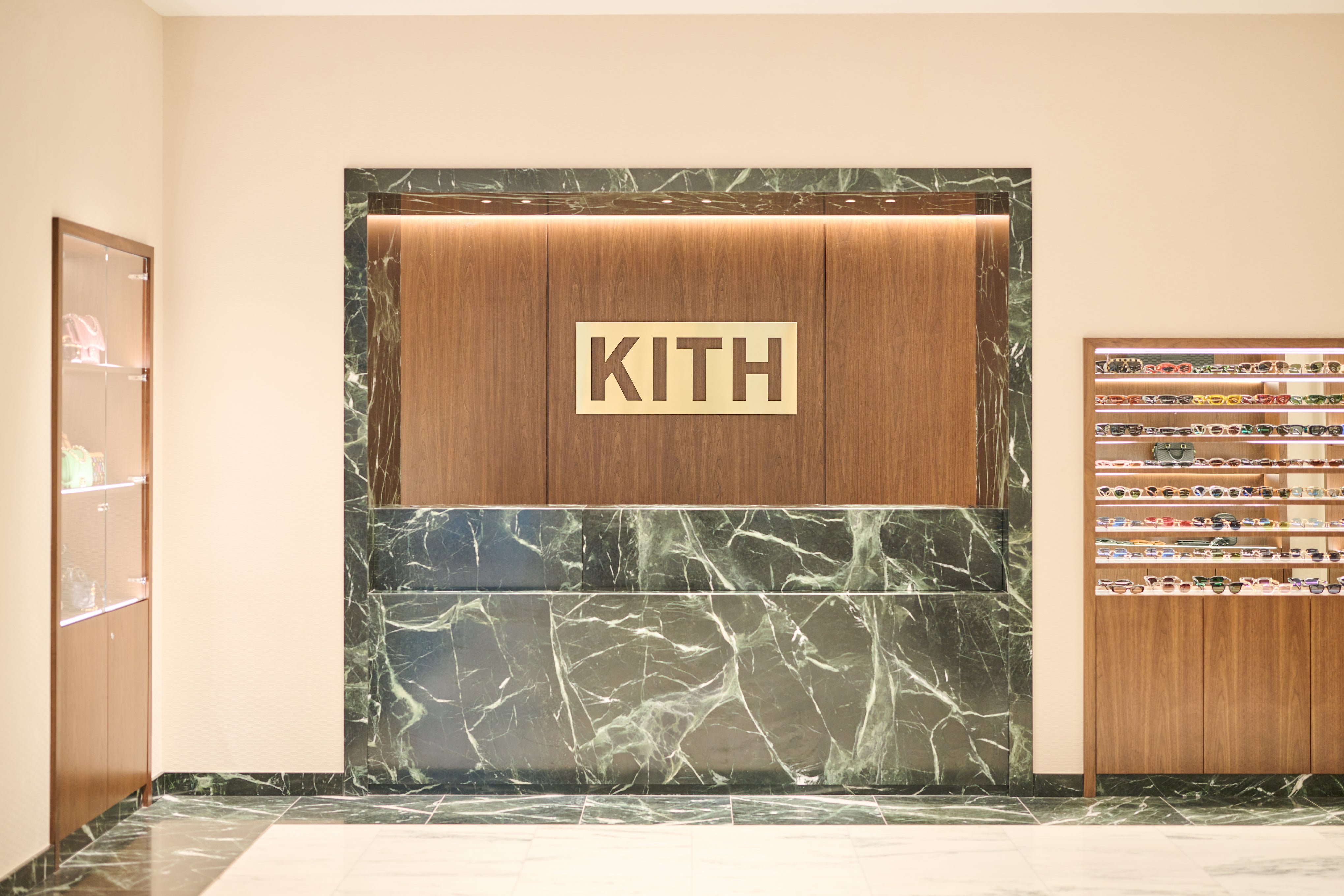 The ambiance is elevated with a careful balance of white, blue and brown hues—alongside calming greenery tastefully placed throughout the store. Our changing rooms and elevators are covered with Kith Classic logo vegan leather wallpaper. The Kith Treats and Sadelle’s area is elevated with Rosa Aurora Stone and is complimented by its blend of wood, stone and metal accents—creating a sharp, sophisticated setting.
