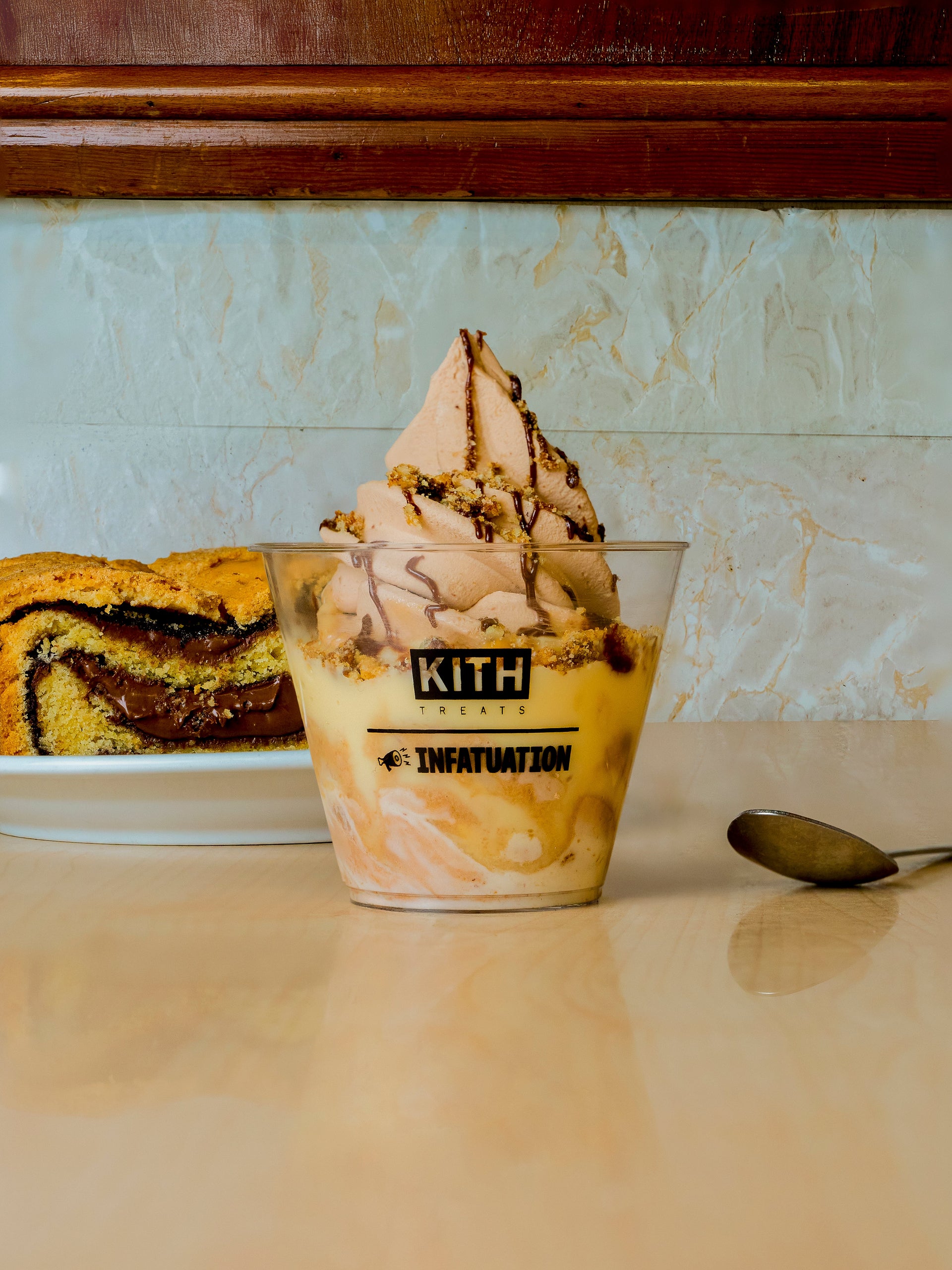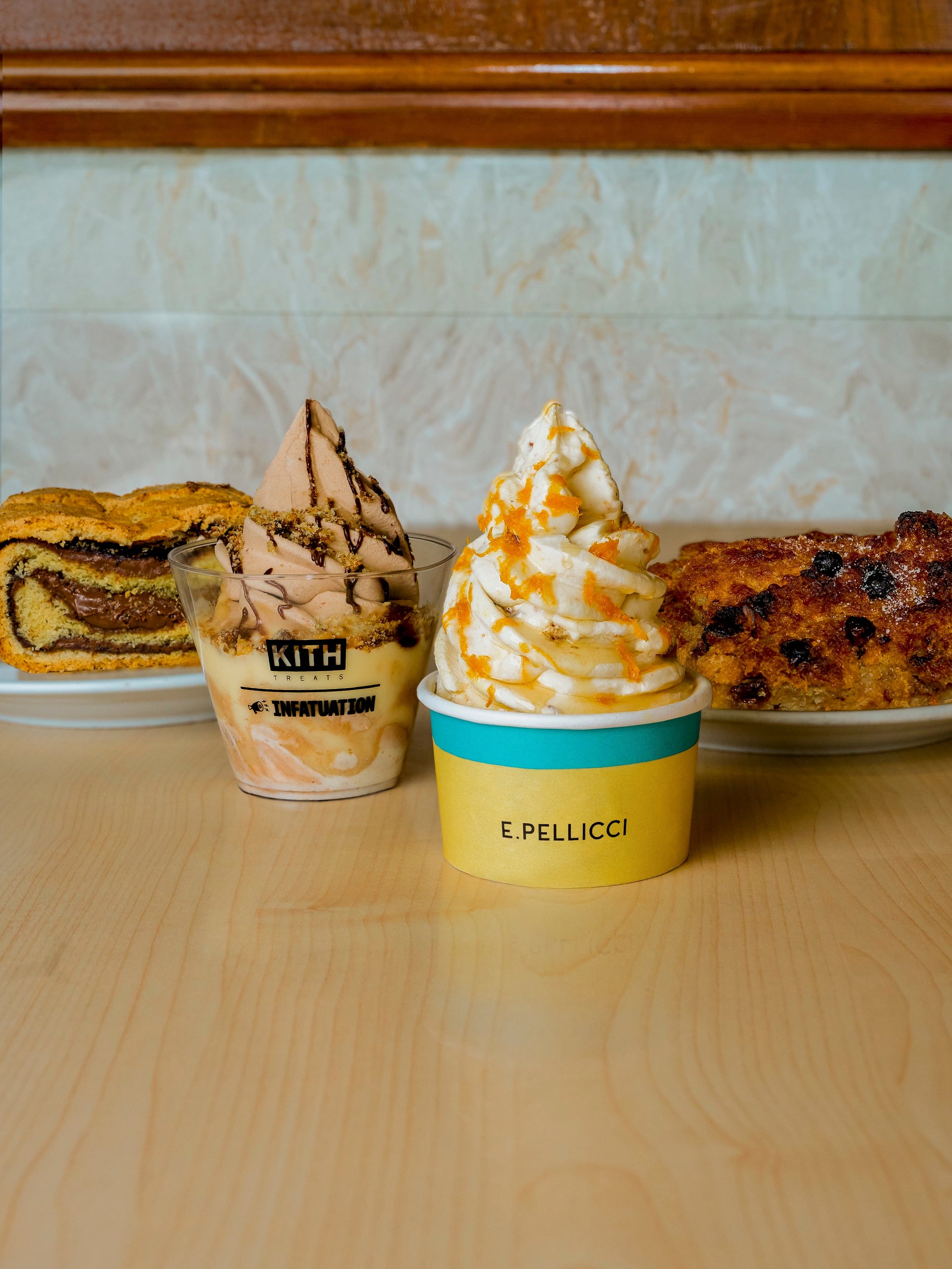 To honor the grand opening of Kith Treats’ latest London flagship, the confectionery has teamed up with the East London ​​trattoria to create two limited-edition ice cream specials inspired by their famous Chocolate Roly Poly and classic Bread Pudding. Each dessert highlights the Italian & British influences found throughout E. Pellicci’s menu, bridging over 125 years of E. Pellici’s storied history with Kith Treats’ decade-long journey of culinary creativity.
