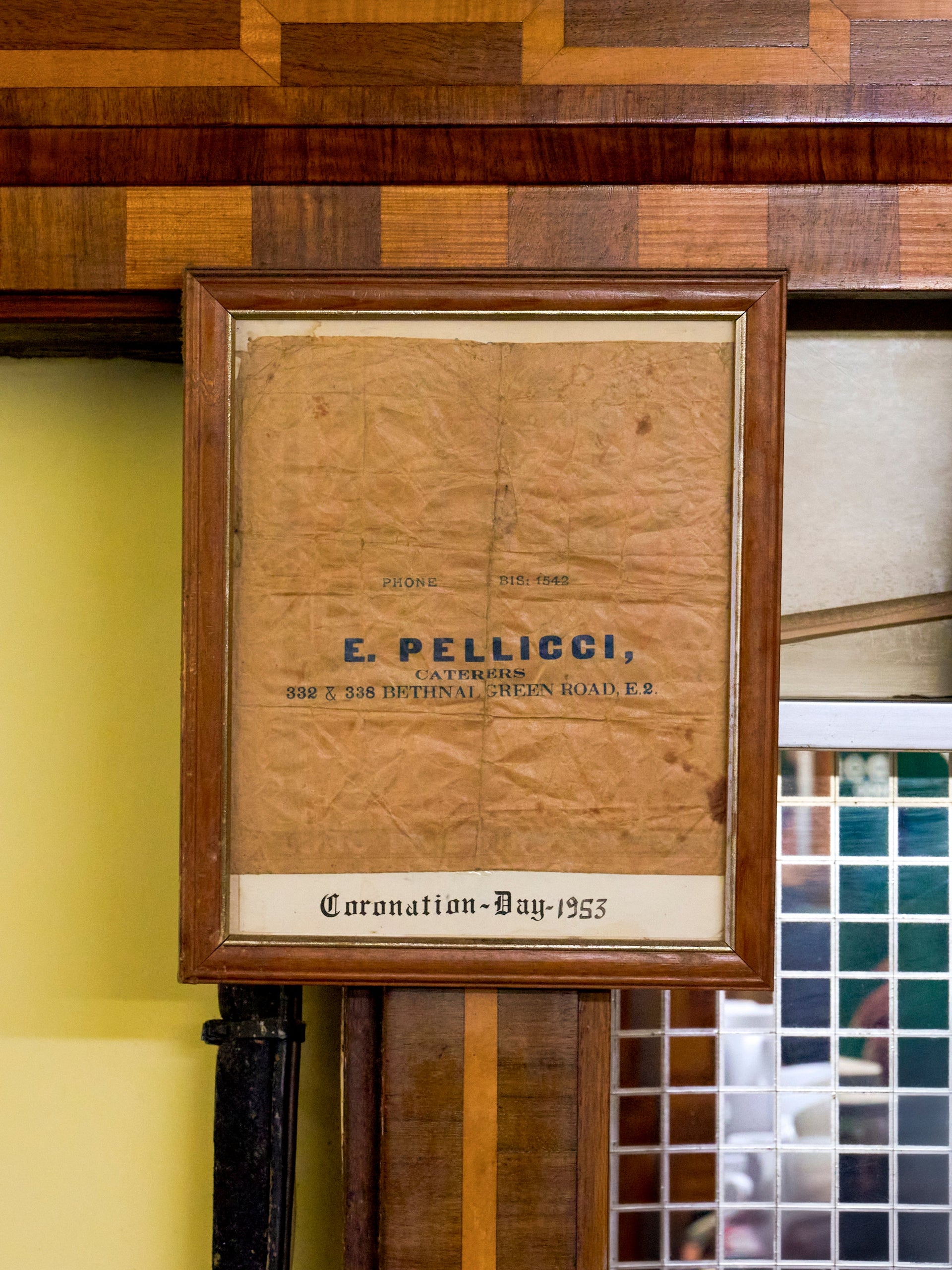 E. Pellicci was founded in 1900 by Priamo Pellicci. His wife Elide, whose first initial is the “E” in E. Pellicci, single-handedly raised seven children while running the café below to keep the family after Priamo’s passing in 1931. After Elide’s tenure ended, Nevio Pellicci Sr., who was born in the upstairs of the restaurant, took over the business until his passing in 2008. Today, Maria, Nevio Sr.'s wife, continues the tradition of cooking E. Pellicci's signature Italian dishes passed down through the family lineage, alongside third generation of the Pellicci family members Nevio Pellicci Jr. and his sister Anna Sereno.
