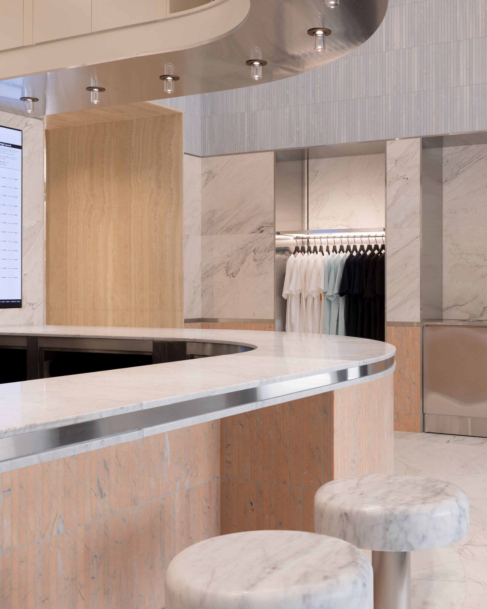 The full-service Kith Treats bar accompanies the store’s design language with an elevated blend of wood, stone and stainless steel accents, highlighted by a Rosa Aurora marble header, countertop & bar-style seating, complete with Kith Treats’ signature parlor-style cereal dispensers. Alongside carrying all Kith Treats’ global inline capsule collections, this new location will serve location-exclusive ice cream specials crafted for the Korean market as well as select Signature Specials from Kith Treats’ mainstay menu.
