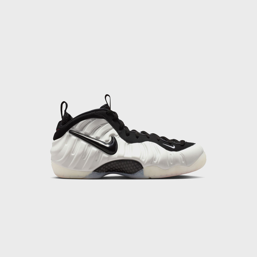 The Foamposite from Nike is notorious for its perfect fit, achieved through the moldable upper, full-length Zoom Air cushioning, and a treaded herringbone outsole. The Pearl White and Black colorway features a color-blocked silhouette, puffed Swoosh detailing, and embroidered branding throughout.