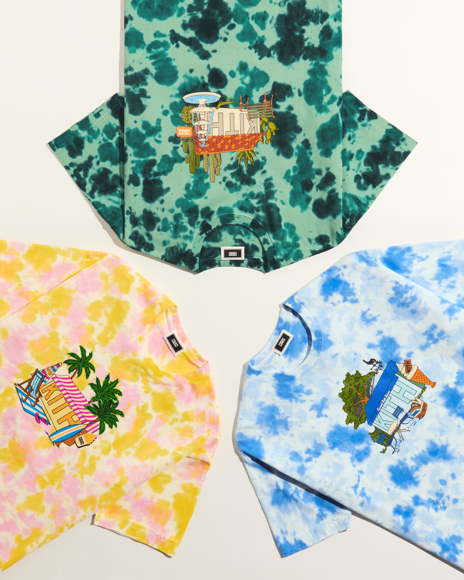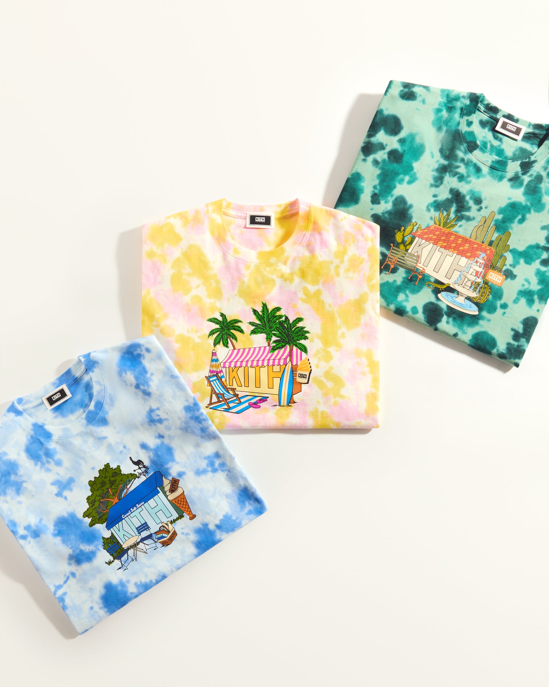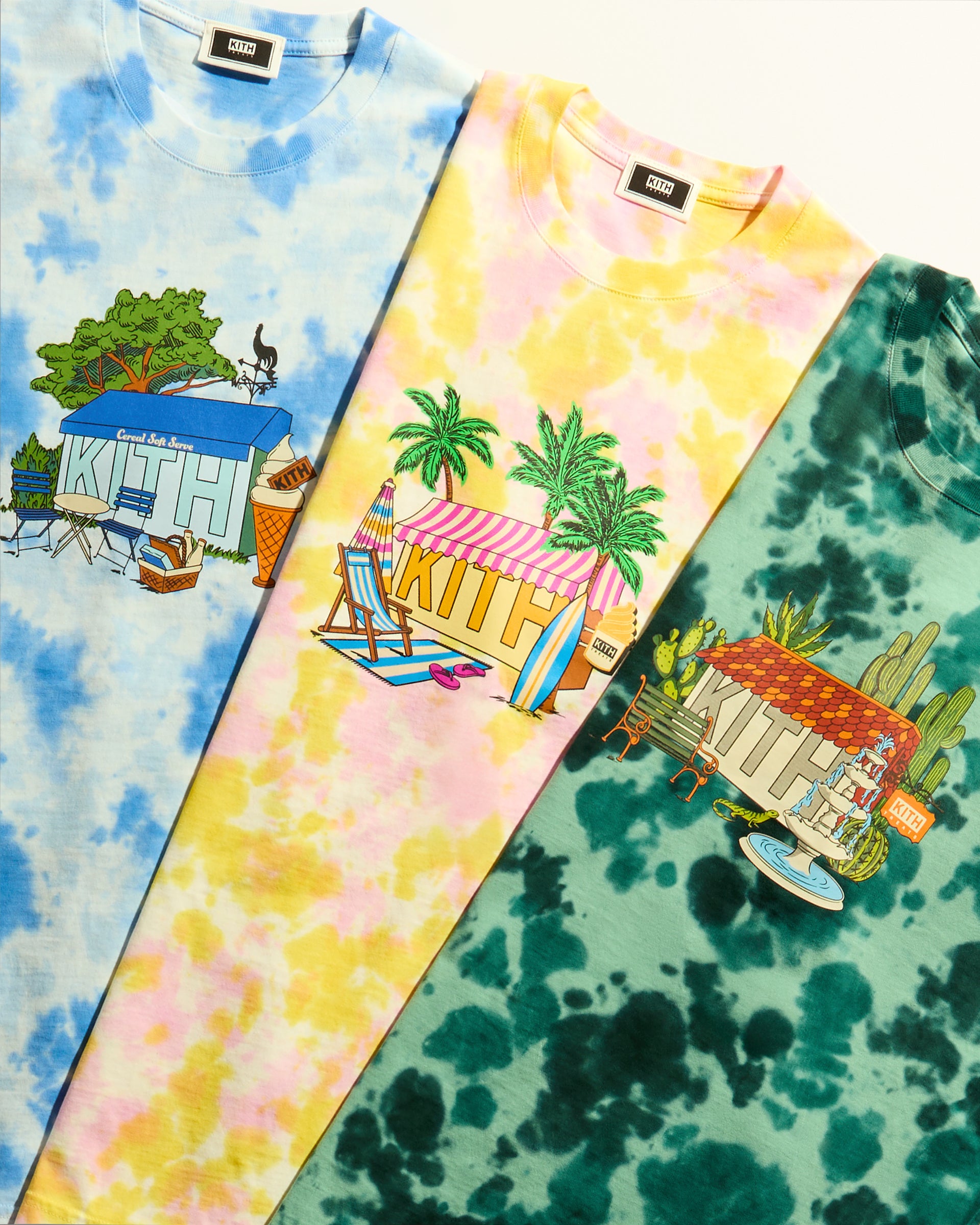 Kith Treats presents Treats Destination—a trio of tie-dye graphic tees adorned with illustrated Kith Treats storefronts in tropical, seaside, and desert-themed havens.