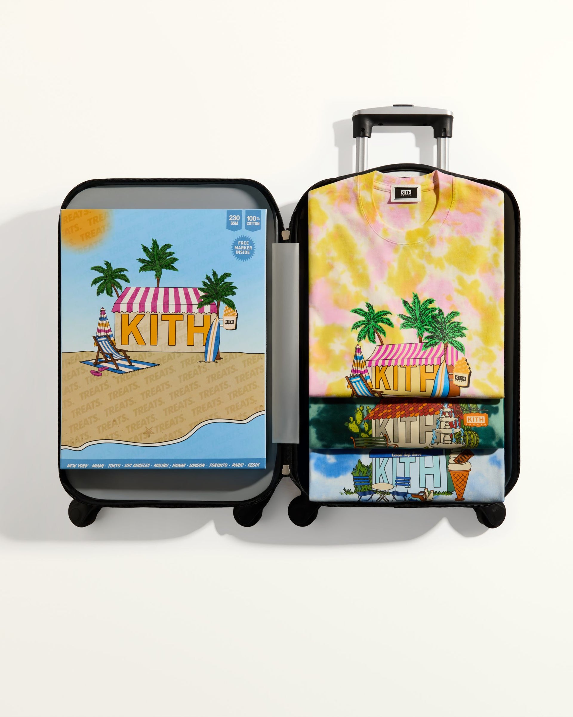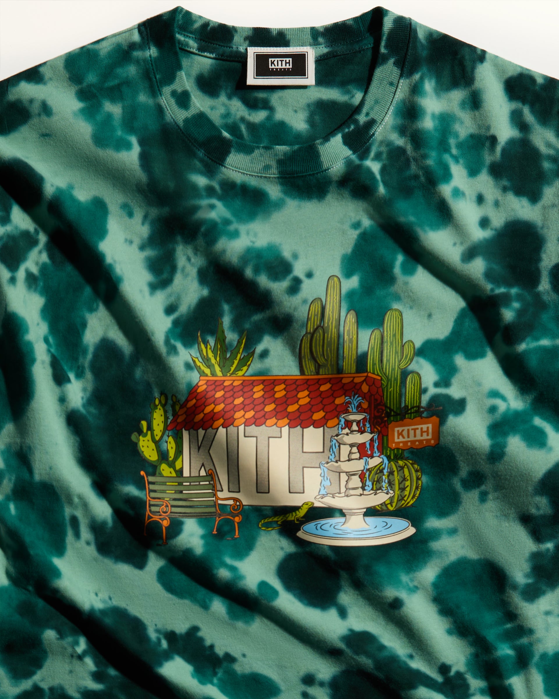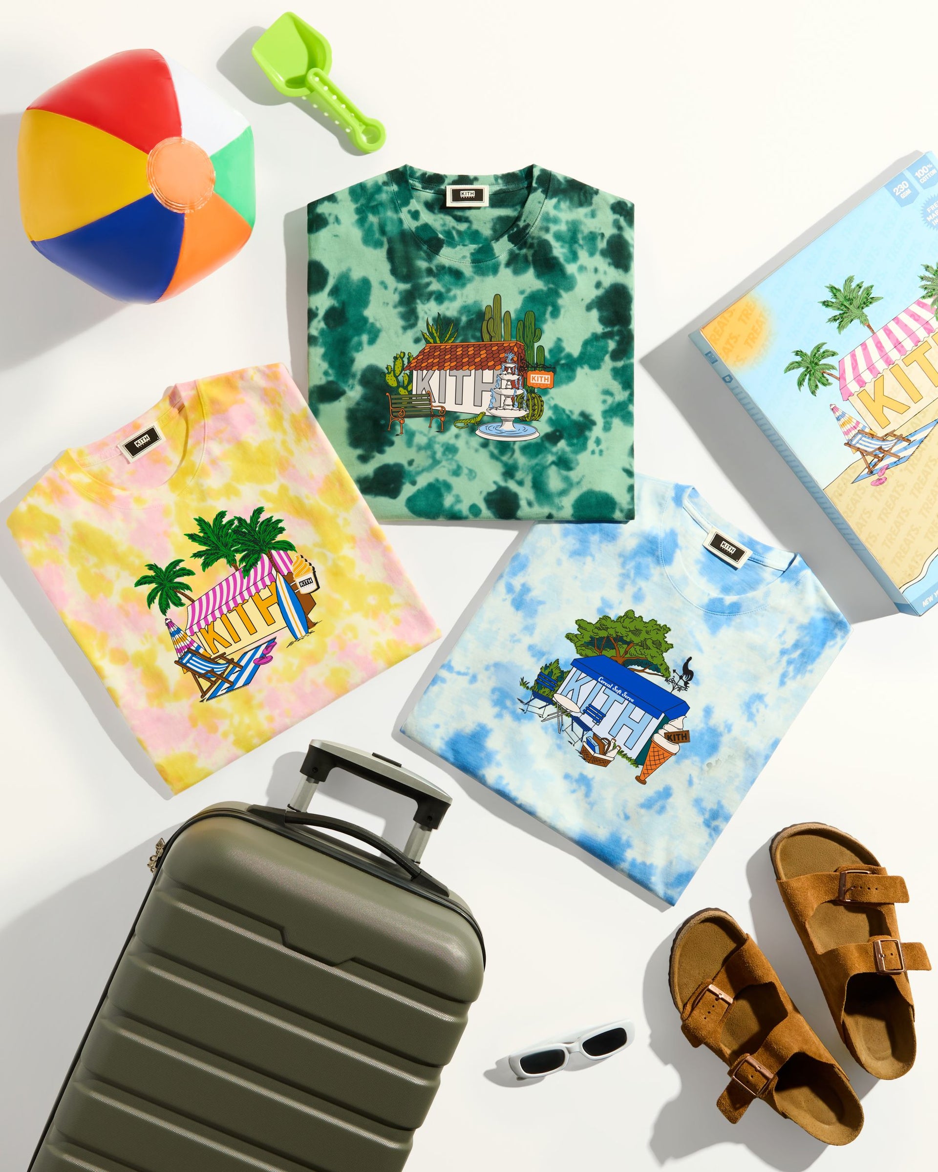 Kith Treats presents Treats Destination—a trio of tie-dye graphic tees adorned with illustrated Kith Treats storefronts in tropical, seaside, and desert-themed havens.
