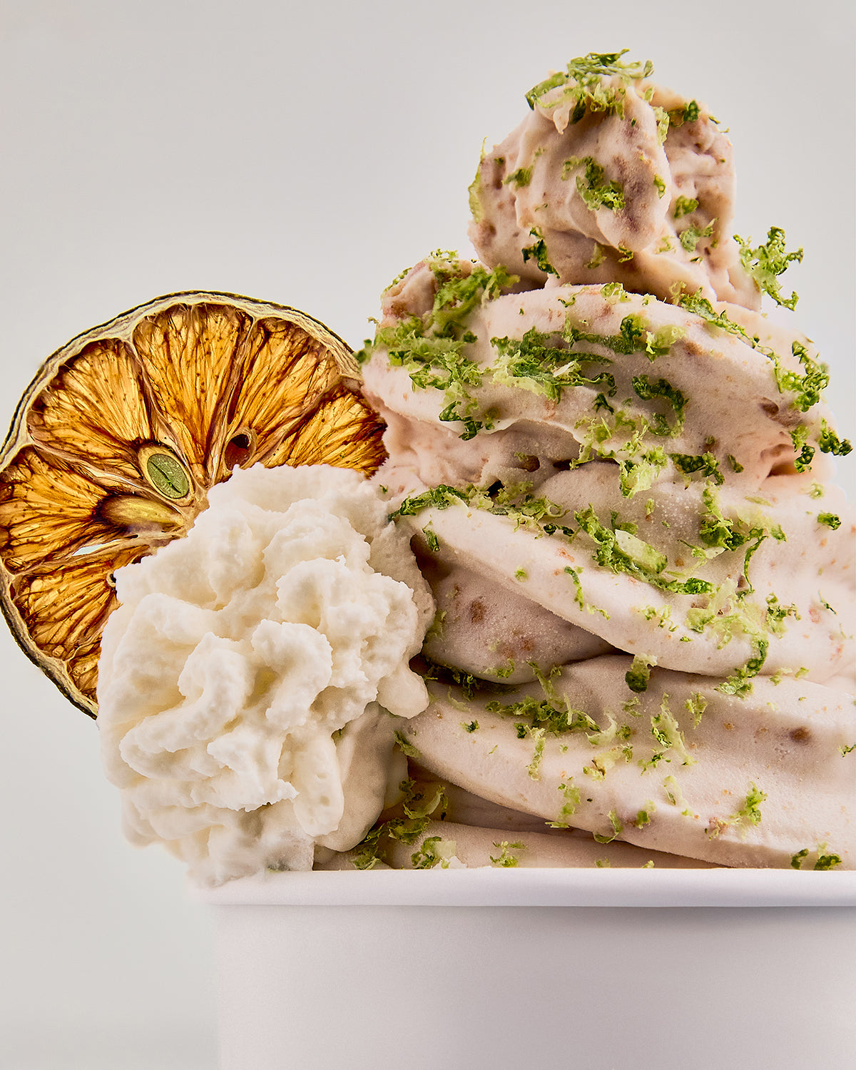 Graham Cracker crust base layer with vanilla ice cream infused with Key Lime Pie, Golden Grahams & Cheesecake Bites, topped with whipped cream, Lime Zest and garnished with a Dried Lime Wedge.