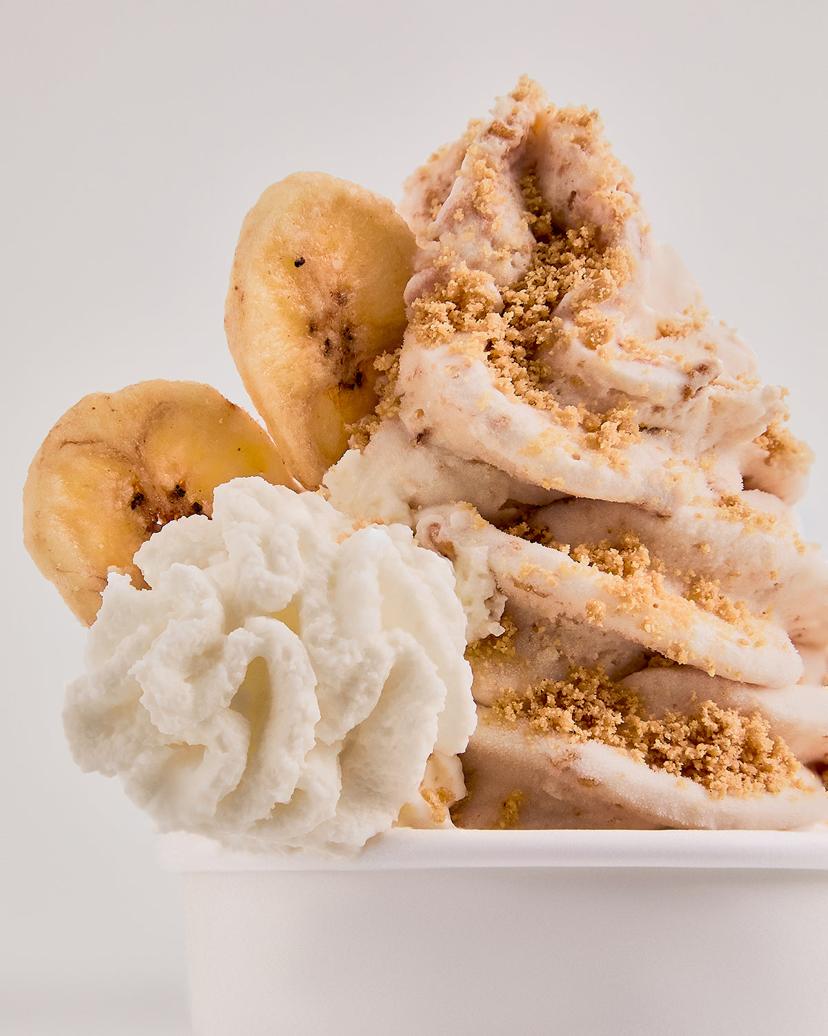 Graham Cracker crust base layer with vanilla ice cream infused with Banana & Golden Grahams, topped with whipped cream, Pie Crust Crumble and garnished with Banana Chips.