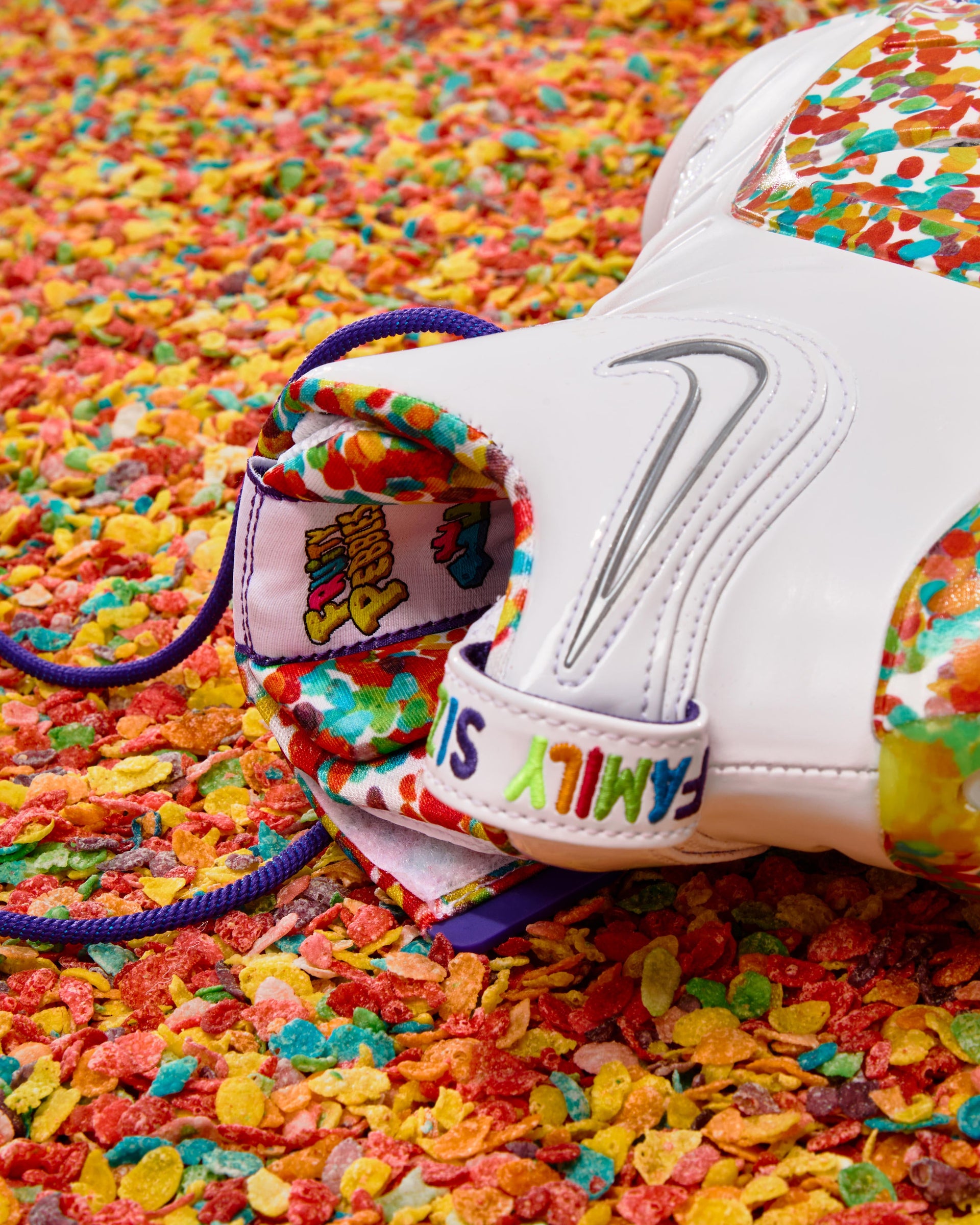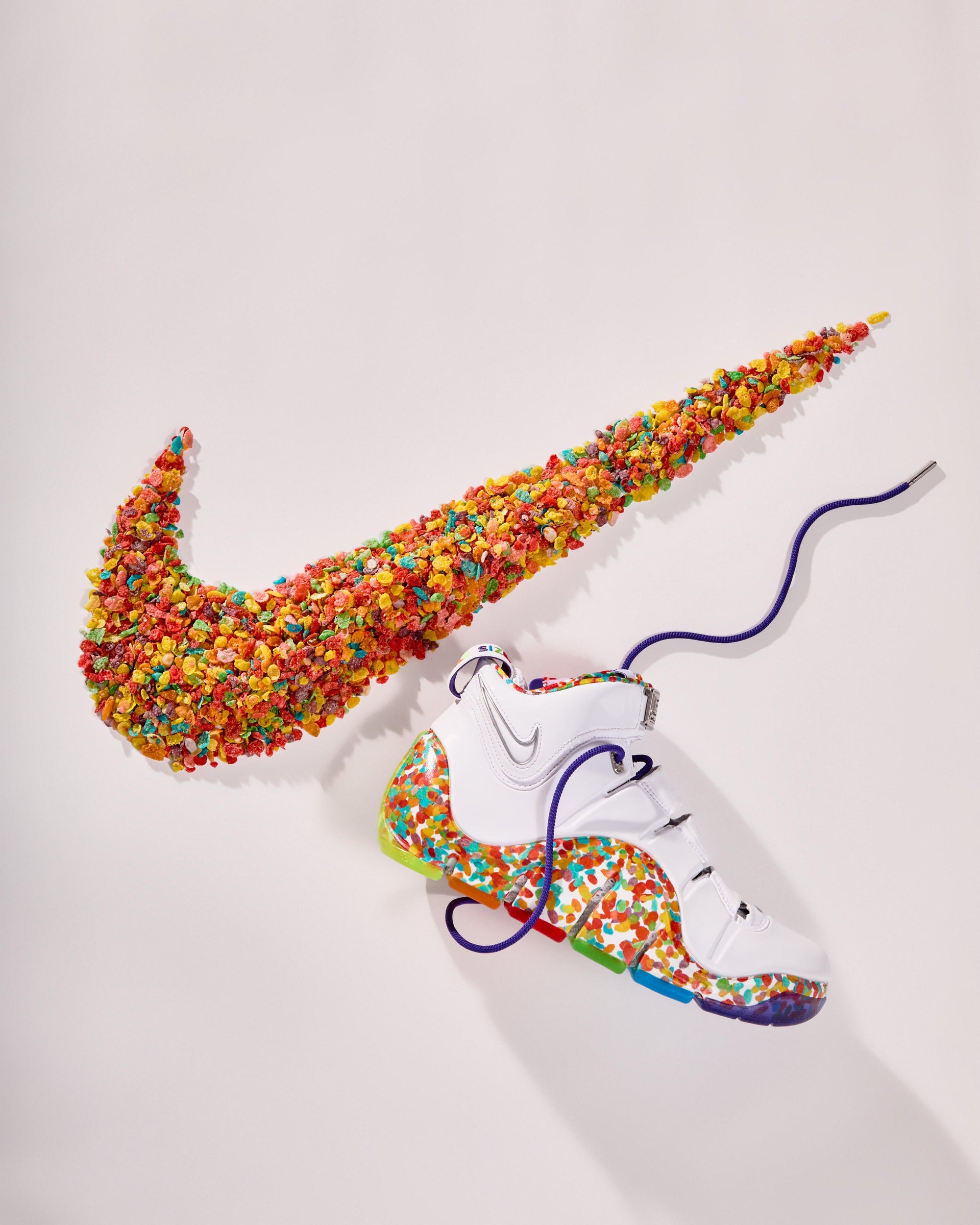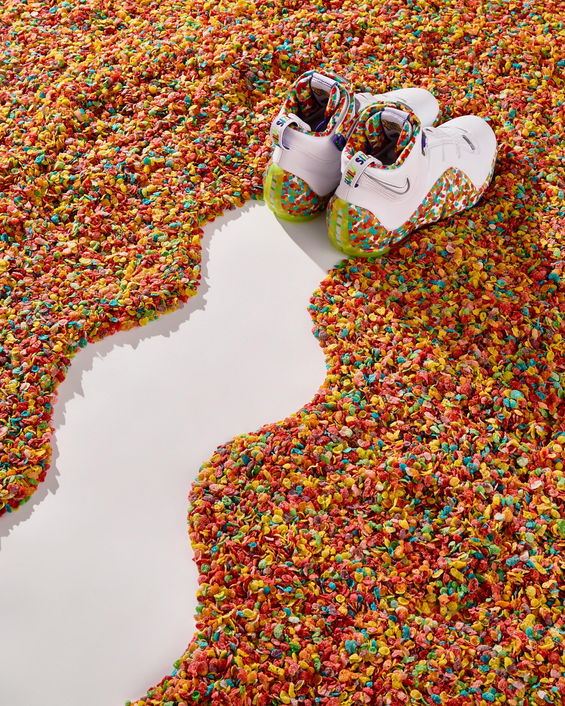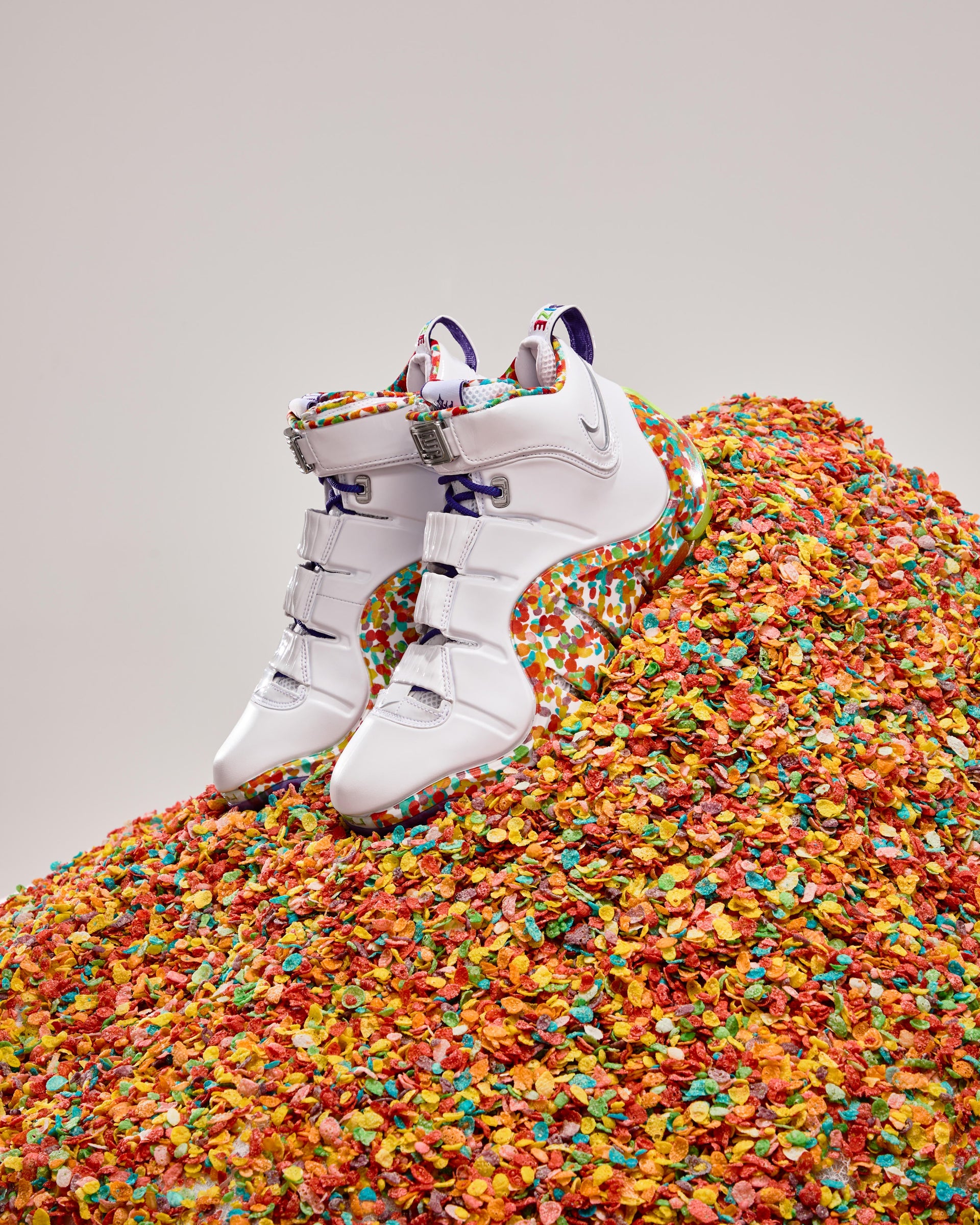 Originally released as a player exclusive, the retro silhouette was nicknamed for its colorful, curved midsole pattern reminiscent of LeBron’s favorite cereal. The pair now sees Fruity PEBBLES branding adorned throughout, officially unifying the coveted sneaker and beloved cereal brand.