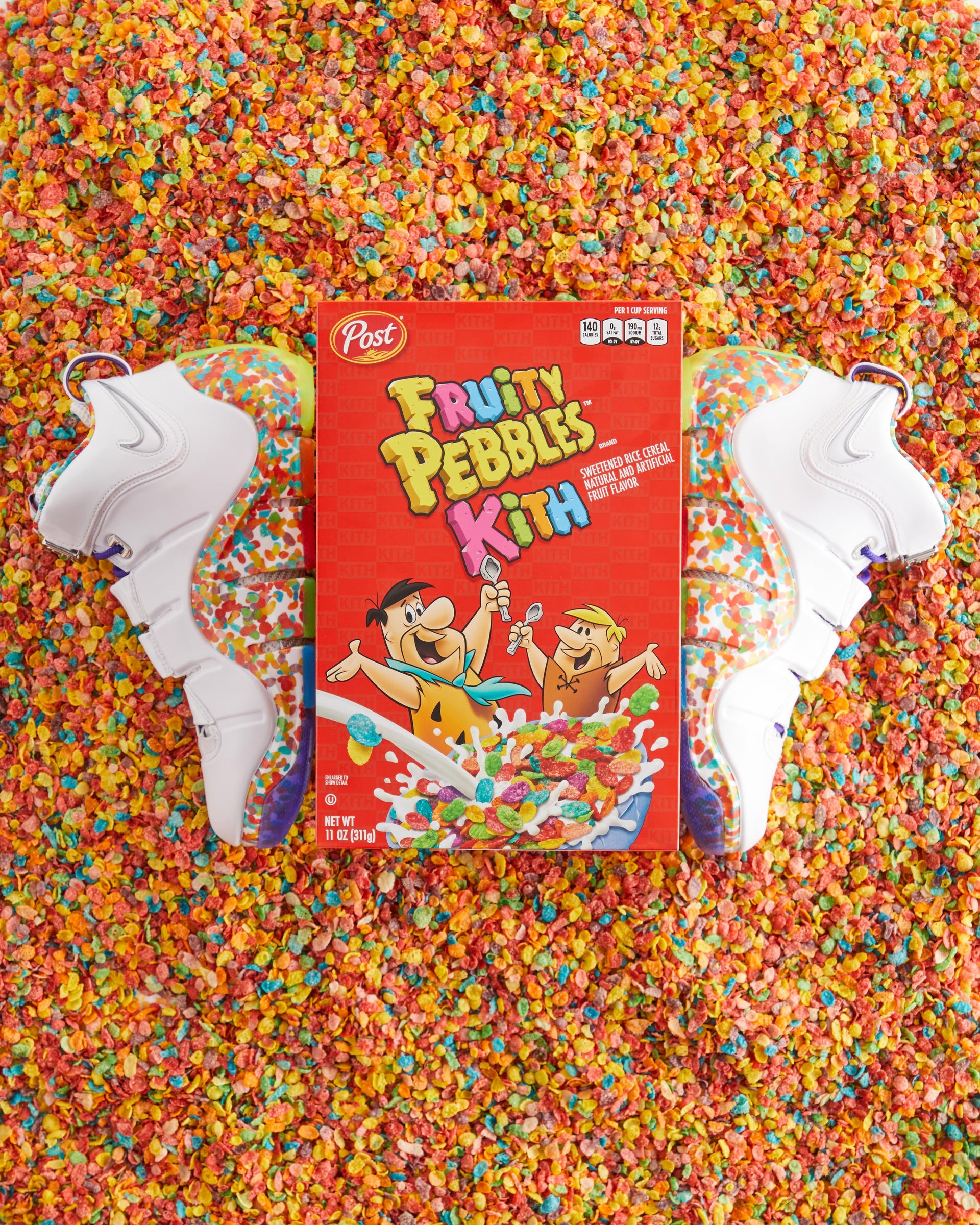 In celebration of National Cereal Day, Kith Treats has teamed up with Fruity PEBBLES™, Nike & LeBron James to honor the release of the Nike LeBron 4 in the “Fruity Pebbles” colorway.