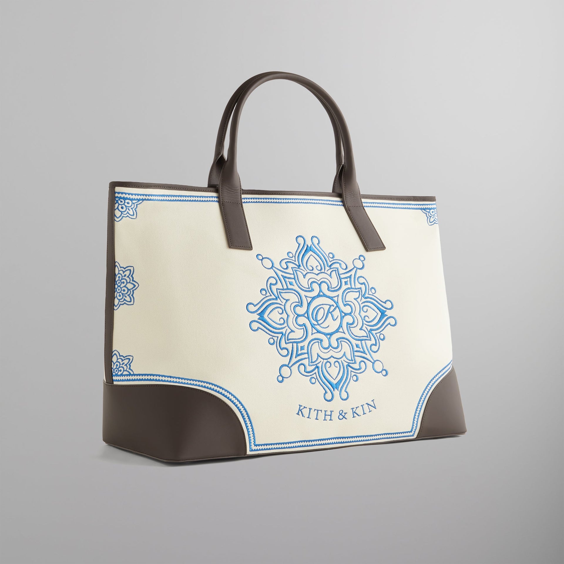 The Embroidered Canvas Tote is made of cotton canvas, featuring leather pinched handles, interior pockets, and embroidered artwork, complete with a leather base and metal feet.Cotton fabric