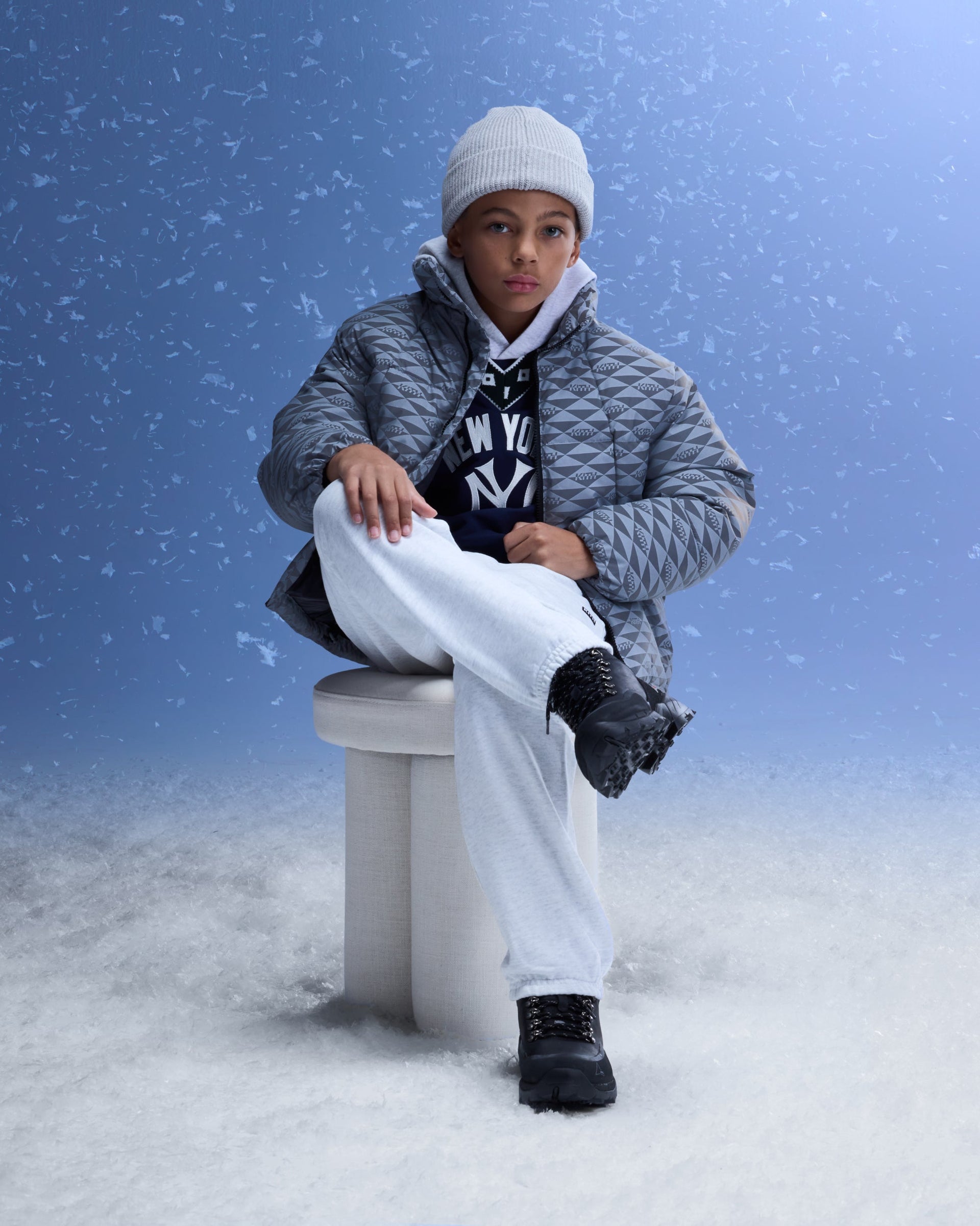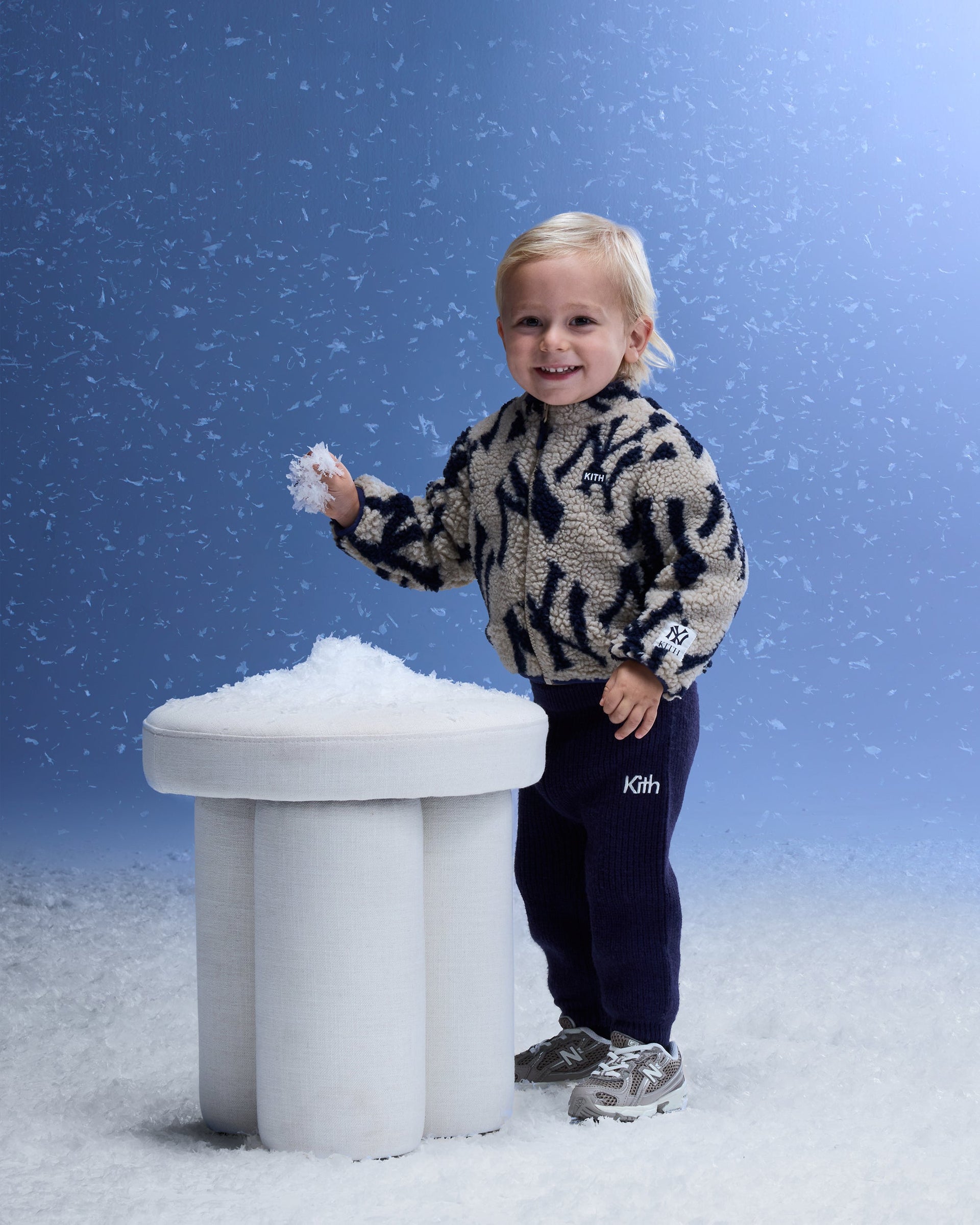 Explore Kith Kids Winter 2025 in baby and toddler sizing, including monogrammed and color-blocked coveralls, graphic bodysuits, detailed outerwear, and coordinated loungewear sets. Standout pieces include the Alina Dress with signature Kith artwork, the Textured Phoebe Dress with pleated accents and bow detailing, and the Sherpa Jacket created in collaboration with the New York Yankees.