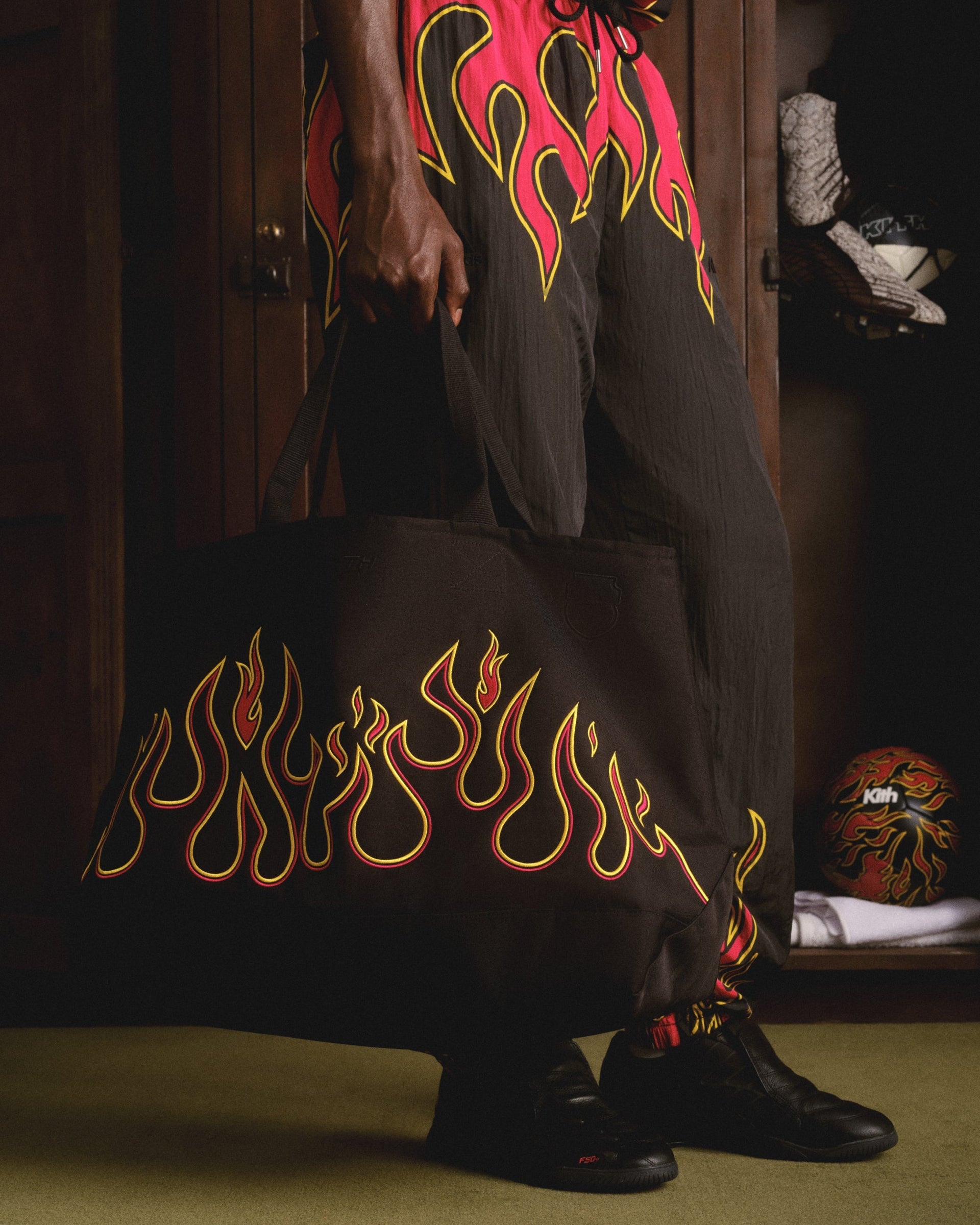 Shop trucker hats and classic caps designed in corresponding prints to the main collection, alongside the carryall Flame Tote, co-branded soccer balls, and cushioned socks ideal for gameplay.