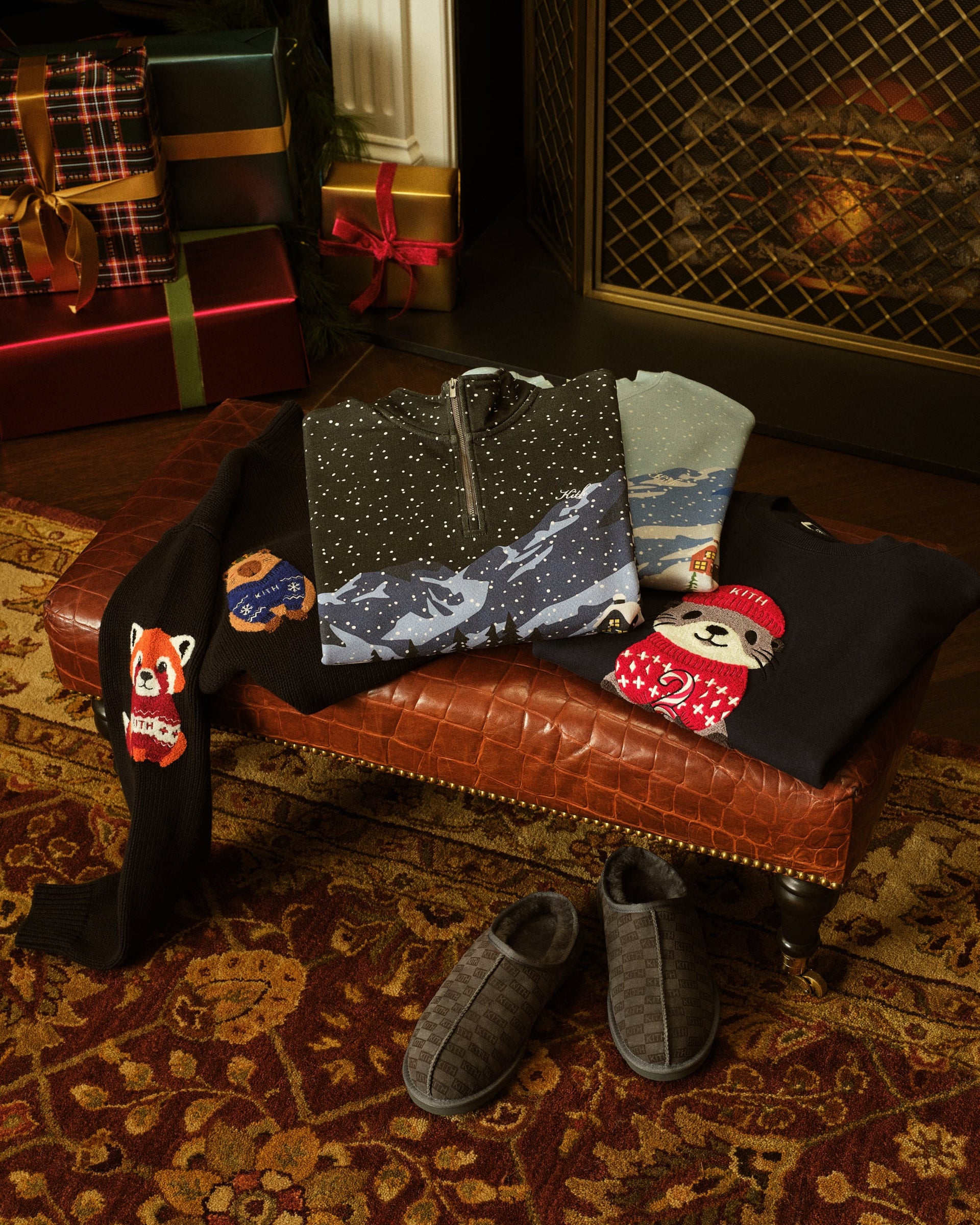 Discover a range of holiday-ready apparel highlighted by the Kith Monogrammed Shearling Coat, crafted from warm lamb shearling, and the Kithmas Duster Cardigan elevated with seasonal embroidery. Additional highlights include the Maverick Bow Hoodie with the matching Lorah Micro Bow Short featuring intricate faux-pearl detailing, the Tanner Sweater Hoodie with signature jacquard artwork, and the Hunter Fairisle Quarter-Zip rendered in chenille. Matching lounge sets wrapped in custom Kith gift boxes round out the apparel assortment. The collection continues into cold-weather accessories with jacquard leg warmers and Shearling Slippers adorned with all-over Kith Monogramming.