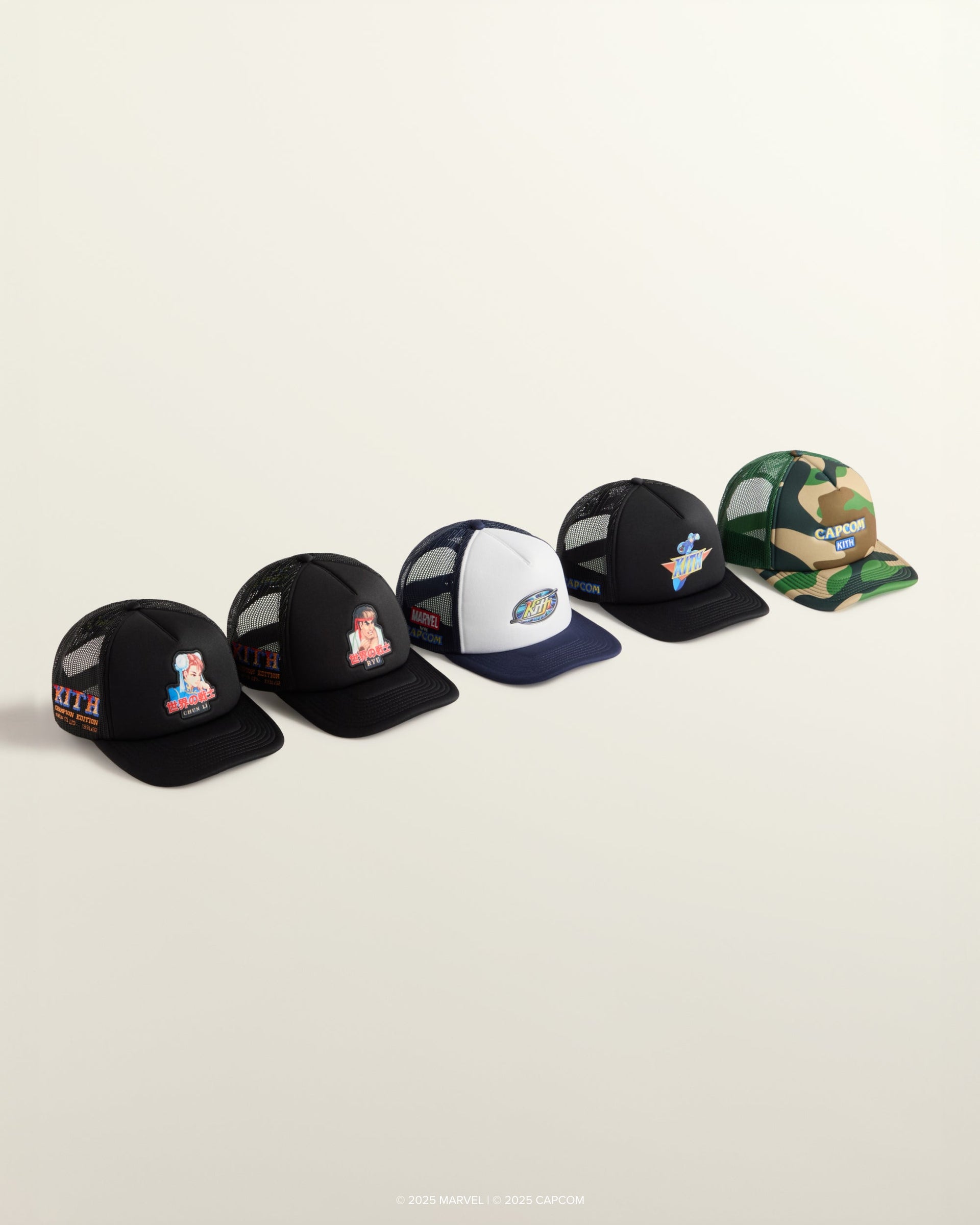 Discover headwear created in partnership with New Era, featuring signature silhouettes including the Low Profile 59FIFTY, the Nolan Trucker Hat, and the Bay Low Pinch Crown Snapback. Each style is reimagined with exclusive Marvel, Capcom, and Kith artwork, spotlighting Marvel icons such as Black Panther, Iron Man, and Wolverine, alongside Capcom legends including Mega Man, Akuma, characters from the Street Fighter series, and more.