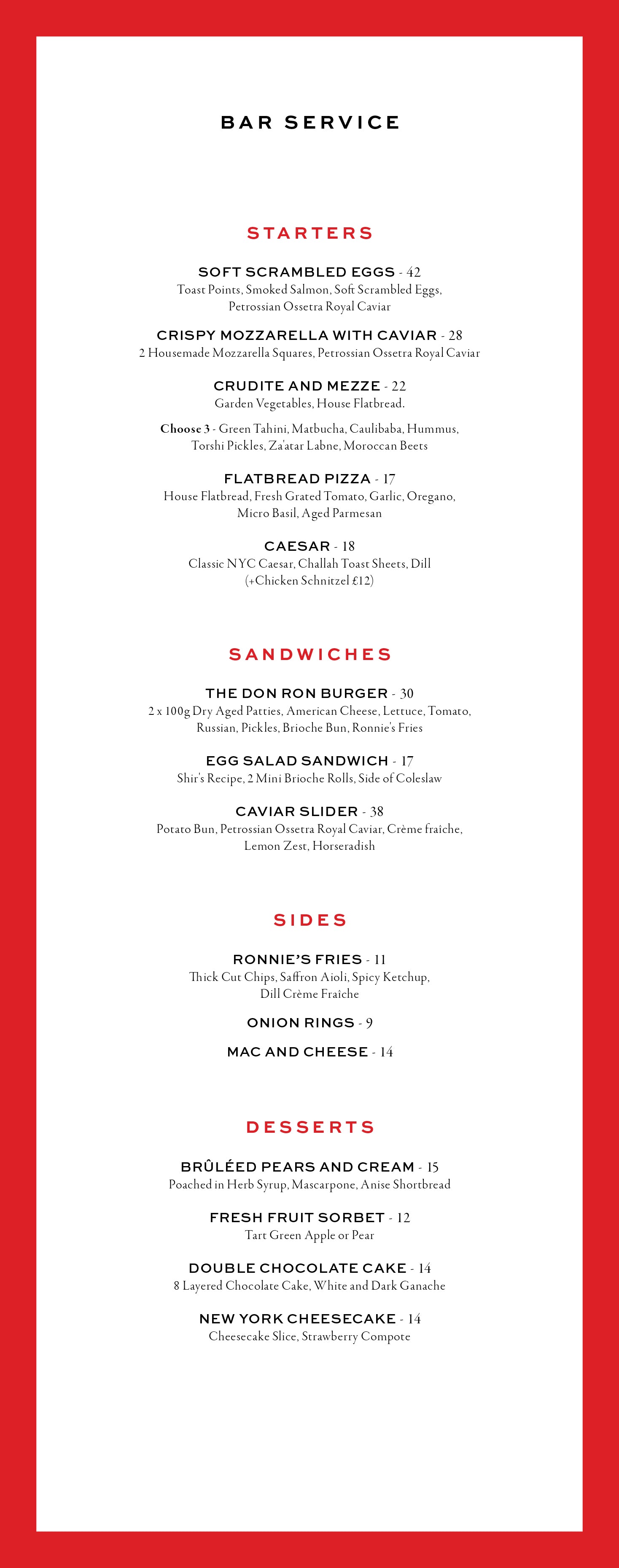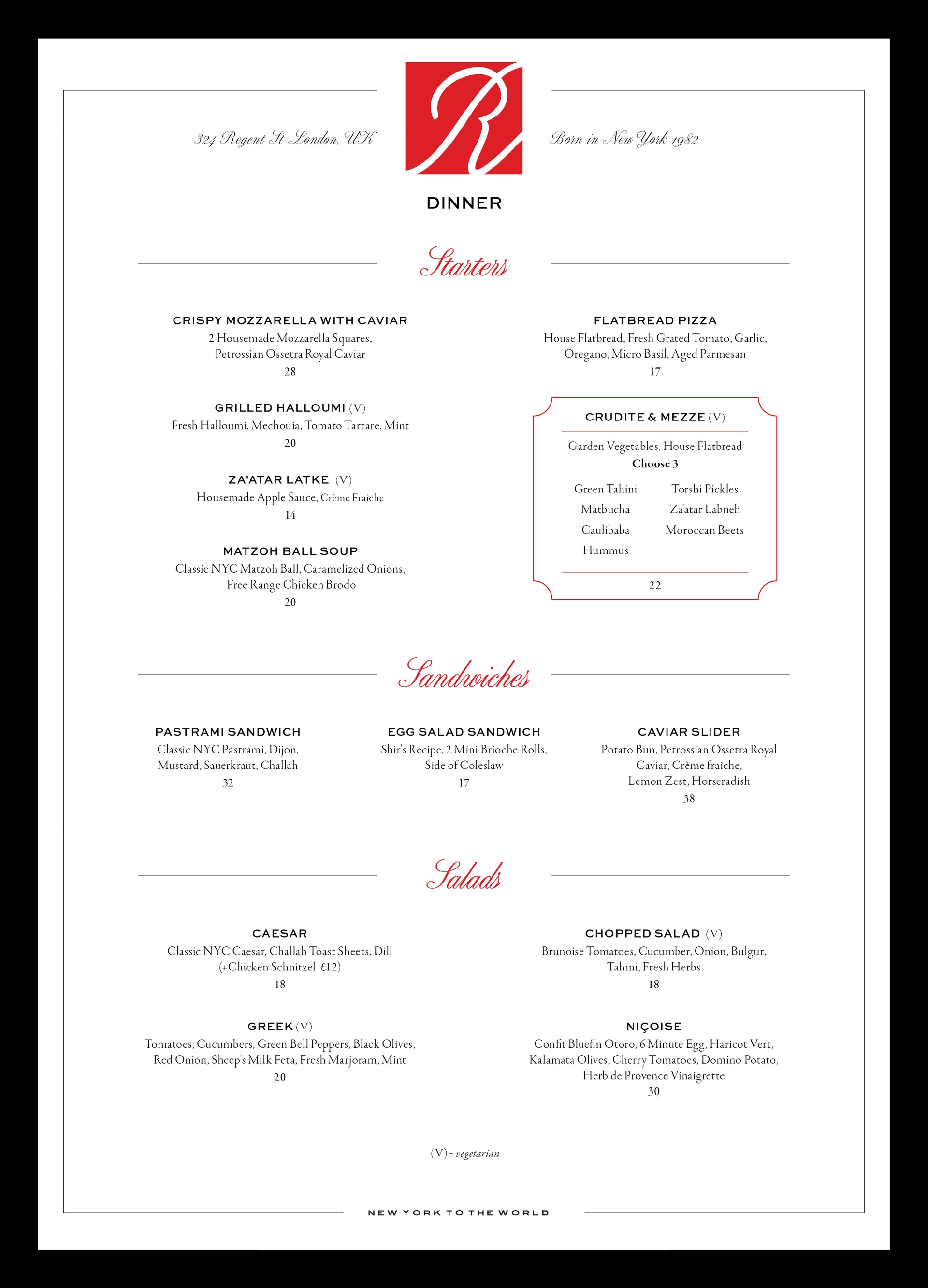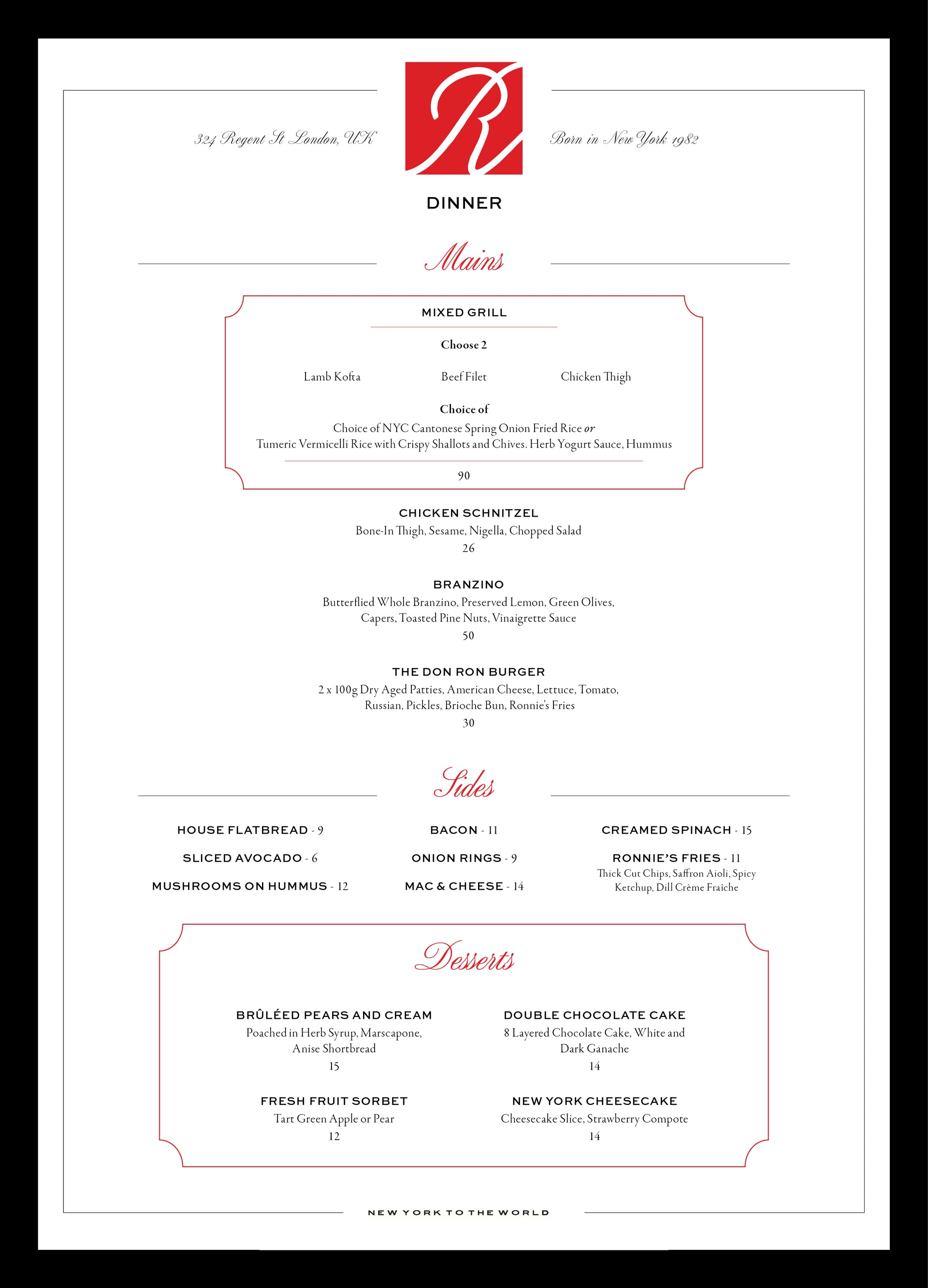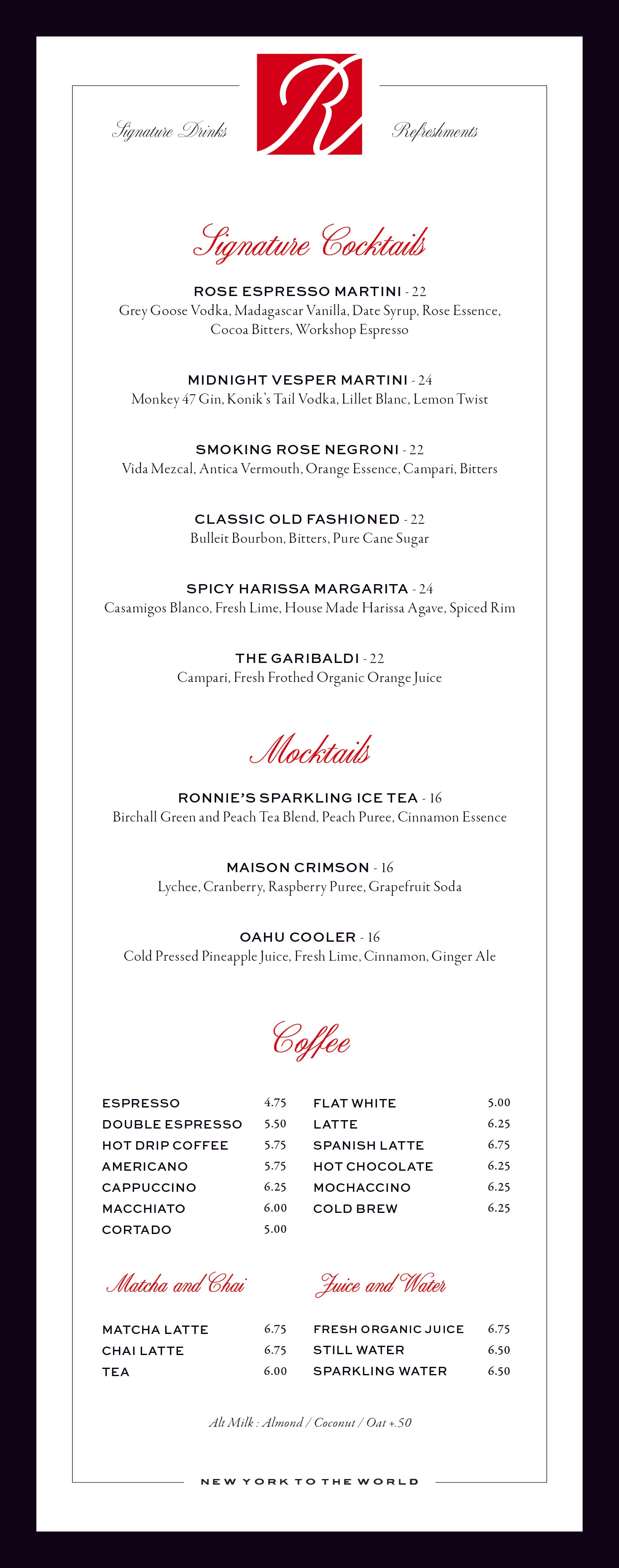 Rooted in the spirit of classic New York City-style dining, Ronnie’s is a Mediterranean-inspired New York bistro where each dish is designed to feel as familiar as it does new—classics reborn through a contemporary lens. At its core, Ronnie’s is a love letter to the city that shaped Ronnie Fieg’s journey—a place where past and present converge at the intersection of style and craft. From modern Mediterranean fare to classic Empire State staples, the restaurant serves as an extension of Kith's ethos—honoring creativity and culinary excellence through a unique dining experience.